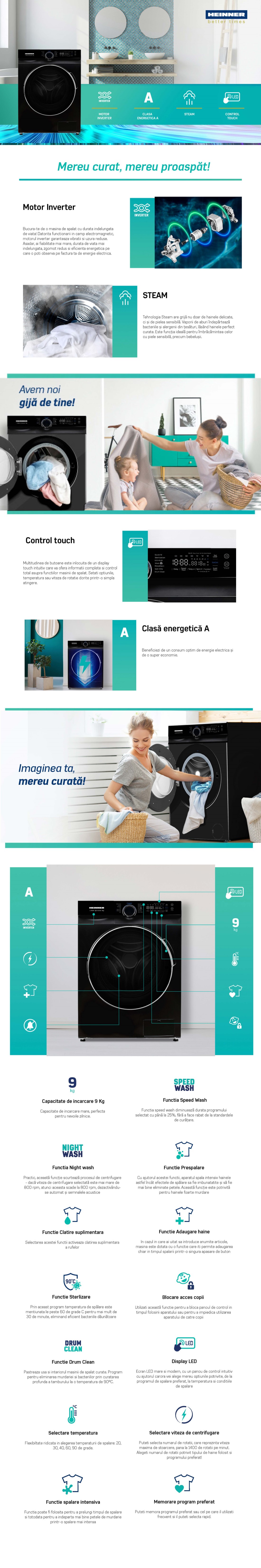 MASINA DE SPALAT RUFE HEINNER HWM-M914IVKBA+++, CAPACITATE 9KG, VITEZA DE CENTRIFUGARE 1400RPM, CLASA ENERGETICA A, MOTOR INVERTER, 14 PROGRAME, CONTROL TOUCH, DISPLAY DIGITAL, PROGRAM RAPID 15 MIN, PROGRAM SPACARE STEAM, PROGRAM BABY CARE, PROGRAM STERILIZARE, CLATIRE SUPLIMENTARA, PRESPALARE, FUNCTIE START INTARZIAT, FUNCTIE SPEED WASH, FUNCTIE ADAUGARE RUFE, MEMORARE PROGRAM PREFERAT, SELECTOR TEMPERATURA, SELECTOR VITEZA DE CENTRIFUGARE, BLOCARE ACCES COPII, DIMENSIUNI ( LXAXI): 59.5X53X85 CM, CULOARE: NEGRU MAT