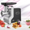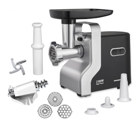 Meat grinder Heinner Weston Silver MG-2100BKSL, 2100W, tomato accessory, sausages and kibbe accessories, mincing capacity: 1.8kg/min, stainless steel blade, 3 cutting plates (3/5/7 mm), reverse function, black/silver