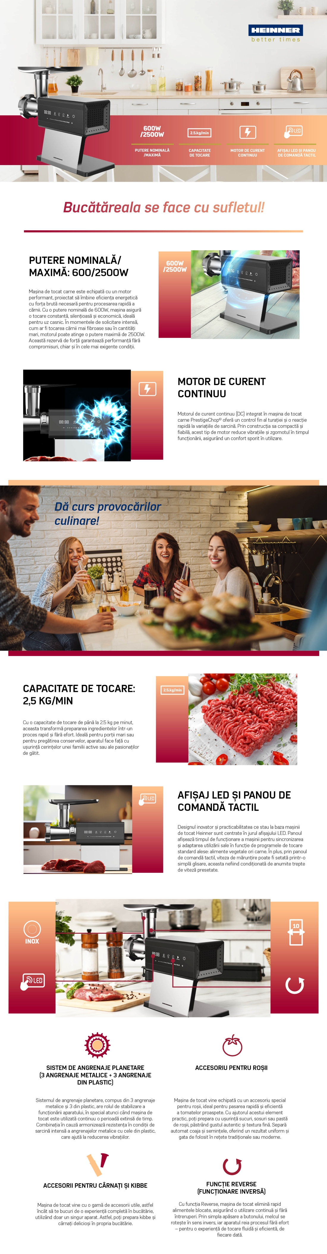 MEAT GRINDER HEINNER PRESTIGECHOP HMG-DTSS2500, 2500W, MOTOR DC, TOUCH CONTROL, PLANETARY GEAR SYSTEM, ACC. FOR TOMATO, KIBBE & SAUSAGES, MINCING CAPACITY 2.5KG/MIN, VARIABLE SPEEDS, STAINLESS STEEL BLADE, 2 STAINLESS STEEL CUTTING PLATES, REVERSE FUNCTION, STAINLESS STEEL