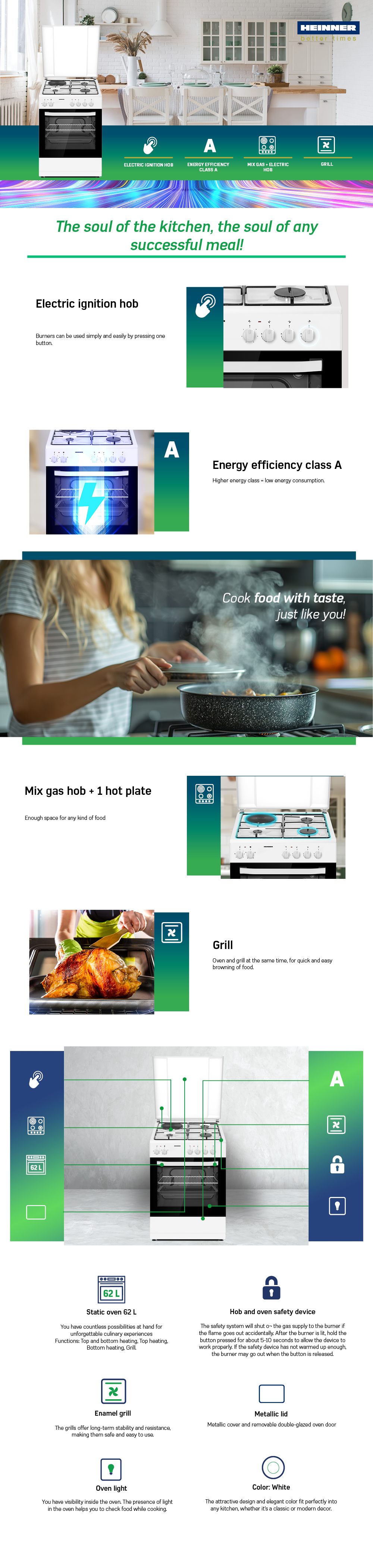 ARAGAZ MIXT HEINNER HFSC-S60E1HSWH, 60X60CM, 3 ARZATOARE GAZ + 1 PLITA ELECRICA, SUPORT EMAIL, CAPAC METALIC, APRINDERE ELECTRICA ARZATOARE, DISPOZITIV DE SIGURANTA ARZATOARE, CUPTOR ELECTRIC, CLASA A, 5 FUNCTII, GRILL, LUMINA CUPTOR, USA CUPTOR CU GEAM DUBLU DETASABIL, DUZE GPL INCLUSE, TAVA SI GRATAR CROMAT, DIMENSIUNI ( LXAXI): 60X60X83 CM, CULOARE: ALB