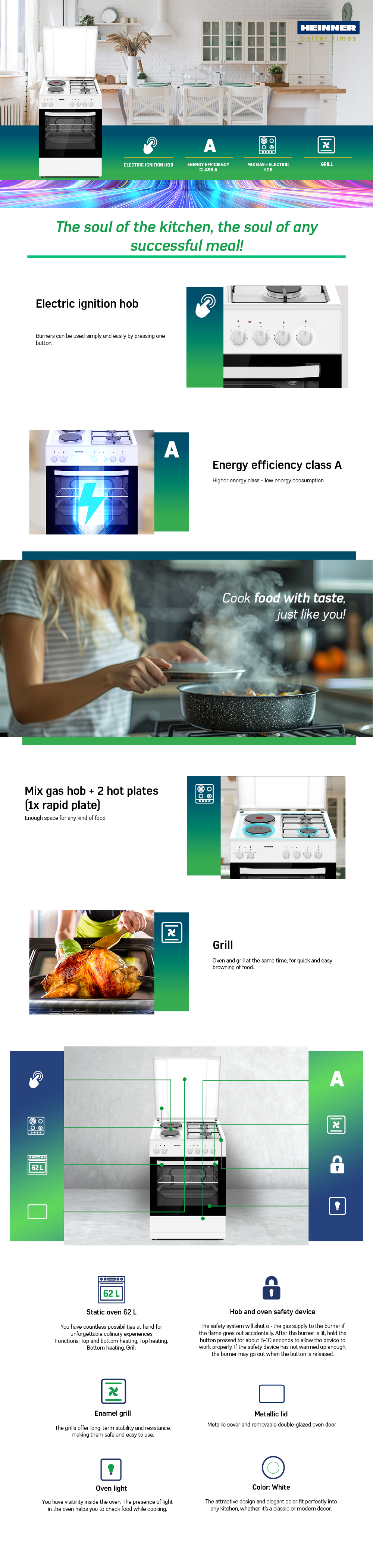 ARAGAZ MIXT HEINNER HFSC-S60E2HSWH, 60X60CM, 2 ARZATOARE GAZ + 2 PLITE ELECTRICE, SUPORT EMAIL, CAPAC METALIC, APRINDERE ELECTRICA ARZATOARE, DISPOZITIV DE SIGURANTA ARZATOARE, CUPTOR ELECTRIC, CLASA A, 5 FUNCTII, GRILL, LUMINA CUPTOR, USA CUPTOR CU GEAM DUBLU DETASABIL, DUZE GPL INCLUSE, TAVA SI GRATAR CROMAT, DIMENSIUNI ( LXAXI): 60X60X83 CM, CULOARE: ALB