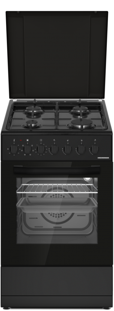 MIXT COOKER HEINNER HFSC-S60LITGC-BK, 4 GAS BURNERS, GAS SAFETY HOB , AUTO IGNITION HOB, ENAMEL PAN SUPPORT, ELECTRIC OVEN, 6 FUNCTIONS, TIMER, GRILL, FAN, OVEN LIGHT, METALIC LID, DOUBLE GLASS OVEN DOOR, BOTTOM DRAWER, SPARE LPG NOZZLES INCLUDED, ACCESSORIES: OVEN TRAY AND GRID, PRODUCT DIMENSIONS(WXDXH): 49.8X61X86 CM, COLOR: BLACK