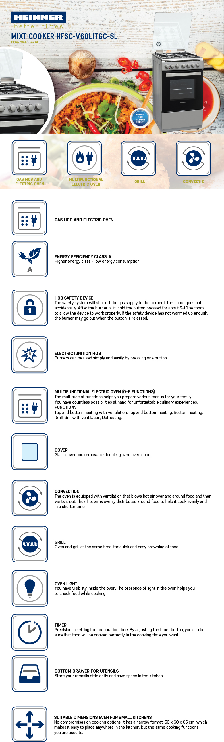 Mixt cooker Heinner HFSC-V60LITGC-SL, 50x60cm, 4 Gas burners, Enamel pan support, Glass lid, Auto ignition for hob, Gas safety hob, Electric oven, 6 Functions, Timer, Grill, Fan, Defrost, Interior oven light, Removable double glass oven door, Bottom drawer, NG settled, Spare LPG nozzles included, Oven tray and grid, Dimensions (WxDxH): 50x60x85 cm, Color: Silver