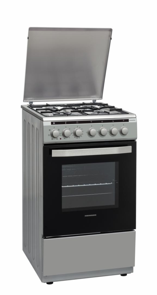 Mixt cooker Heinner HFSC-V60LITGC-SL, 50x60cm, 4 Gas burners, Enamel pan support, Glass lid, Auto ignition for hob, Gas safety hob, Electric oven, 6 Functions, Timer, Grill, Fan, Defrost, Interior oven light, Removable double glass oven door, Bottom drawer, NG settled, Spare LPG nozzles included, Oven tray and grid, Dimensions (WxDxH): 50x60x85 cm, Color: Silver