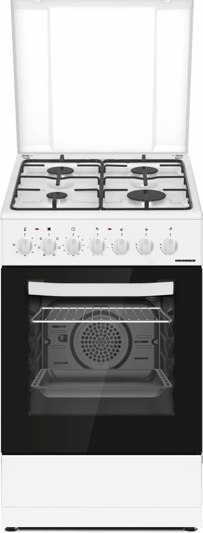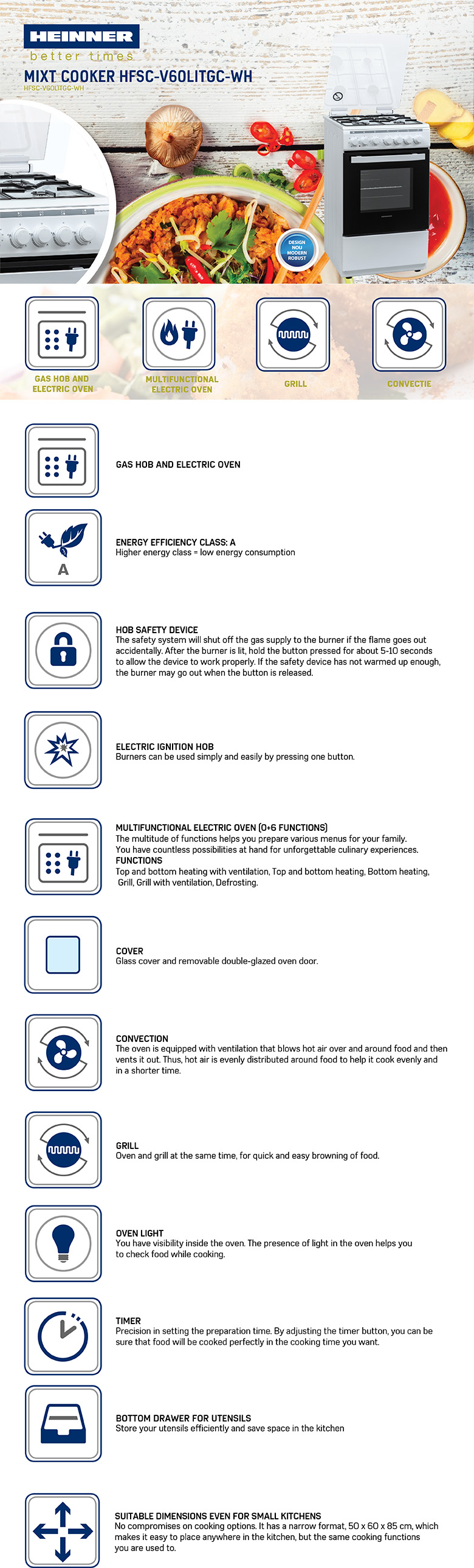 Mixt cooker Heinner HFSC-V60LITGC-WH, 50x60cm, 4 Gas burners, Enamel pan support, Glass lid, Auto ignition for hob, Gas safety hob, Electric oven, 6 Functions, Timer, Grill, Fan, Defrost, Interior oven light, Removable double glass oven door, Bottom drawer, NG settled, Spare LPG nozzles included, Oven tray and grid, Dimensions (WxDxH): 50x60x85 cm, Color: White