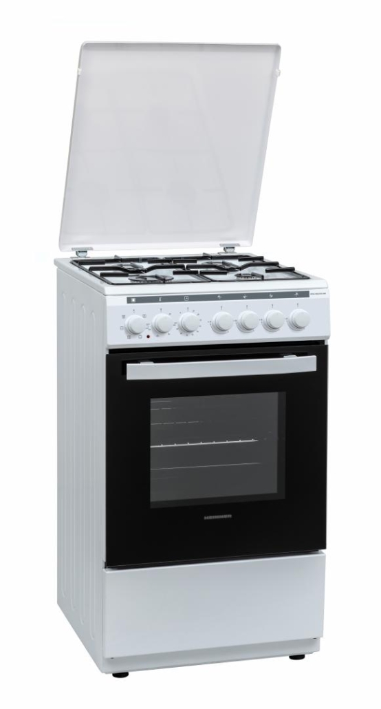 Mixt cooker Heinner HFSC-V60LITGC-WH, 50x60cm, 4 Gas burners, Enamel pan support, Glass lid, Auto ignition for hob, Gas safety hob, Electric oven, 6 Functions, Timer, Grill, Fan, Defrost, Interior oven light, Removable double glass oven door, Bottom drawer, NG settled, Spare LPG nozzles included, Oven tray and grid, Dimensions (WxDxH): 50x60x85 cm, Color: White