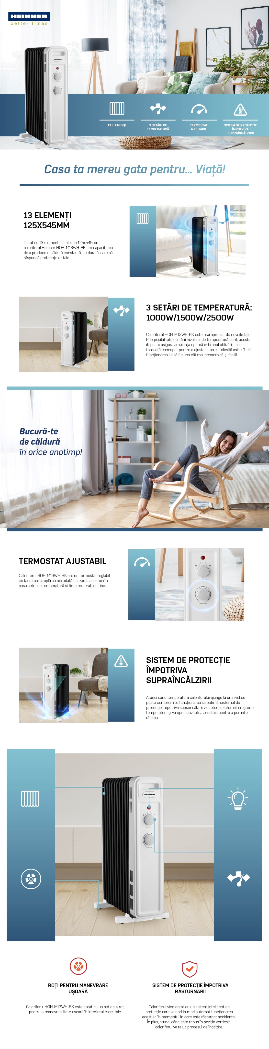 OIL FILLED RADIATOR HEINNER HOH-M13WH-BK, 13 FINS: 125x545 mm, 3 HEATING SETTINGS: 1000W/1300W/2500W, ADJUSTABLE THERMOSTAT, OVERHEAT PROTECTION, TIP OVER SWITCH, WHEELS, CABLE STORAGE, COLOR: WHITE & BLACK
