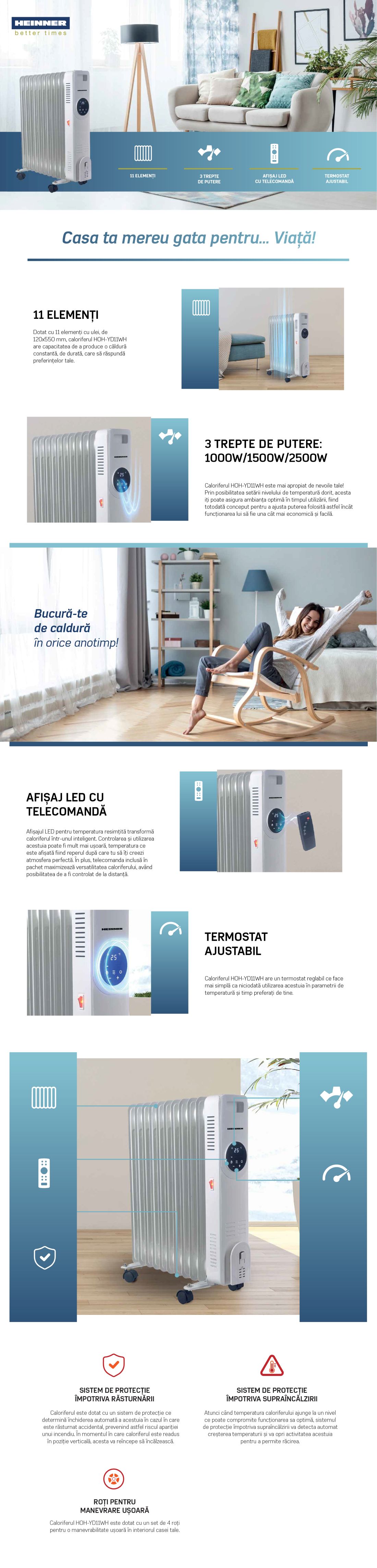 OIL FILLED RADIATOR HEINNER HOH-YD11WH, 11 FINS: 120x550 mm, DISPLAY, REMOTE CONTROL, 3 HEATING SETTINGS: 1000W/1500W/2500W, ADJUSTABLE THERMOSTAT CONTROL, OVERHEAT PROTECTION, TIP OVER SWITCH, WHEELS FOR EASY MOVEMENT, COLOR: WHITE