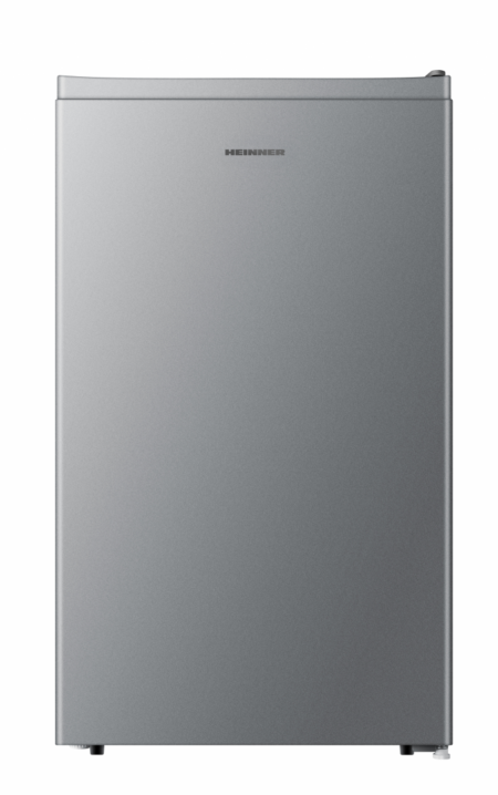 Refrigerator Heinner HF-HS94SE++, energy efficiency class: E, total capacity: 94L, mechanical control with adjustable thermostat, LED light, 1 glass shelf, 1 compartment for fruits and vegetables, reversible door, dimensions (WxDxH): 47.5 x 45 x 84 cm, color: Silver
