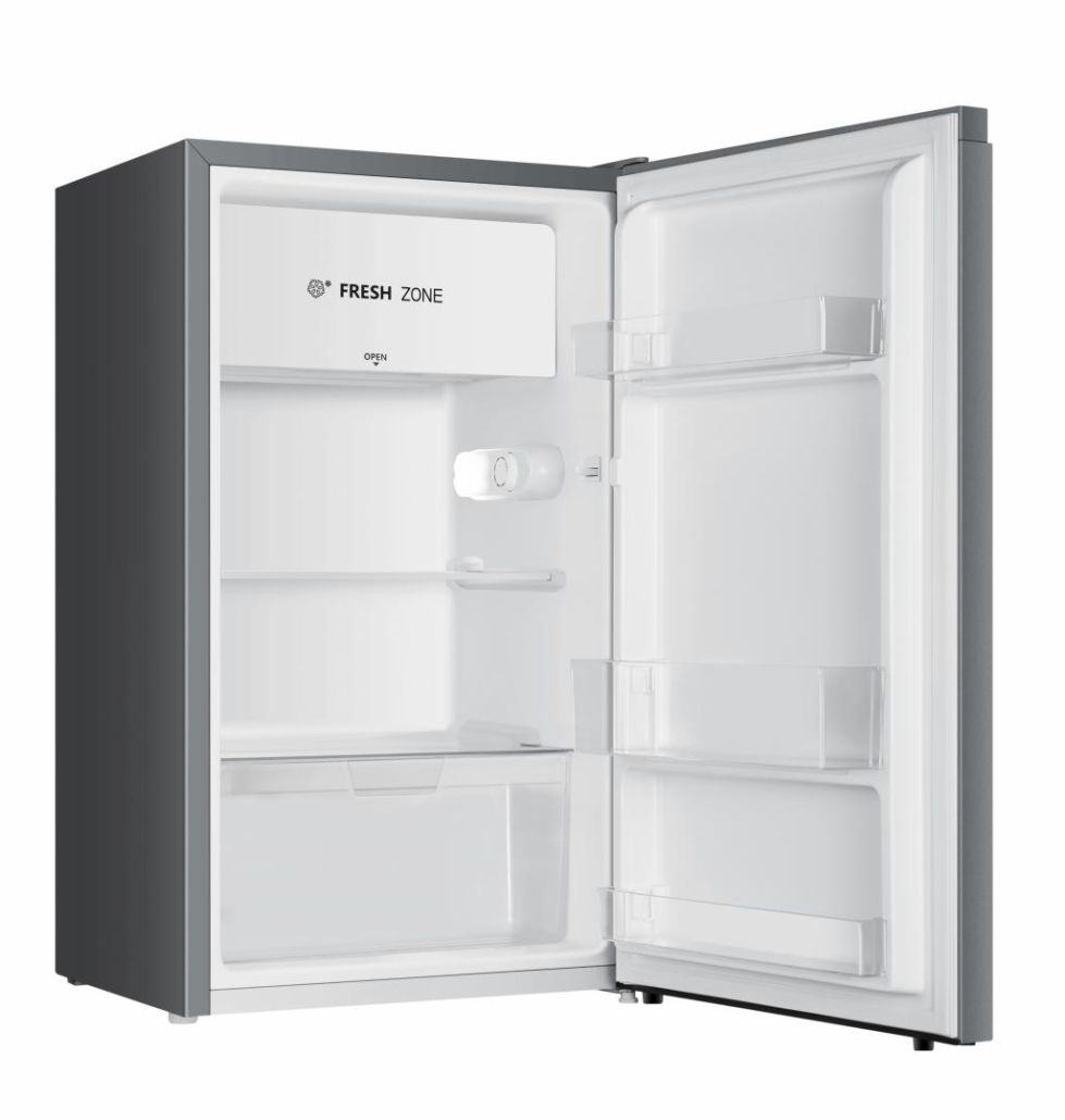 Refrigerator Heinner HF-HS94SE++, energy efficiency class: E, total capacity: 94L, mechanical control with adjustable thermostat, LED light, 1 glass shelf, 1 compartment for fruits and vegetables, reversible door, dimensions (WxDxH): 47.5 x 45 x 84 cm, color: Silver
