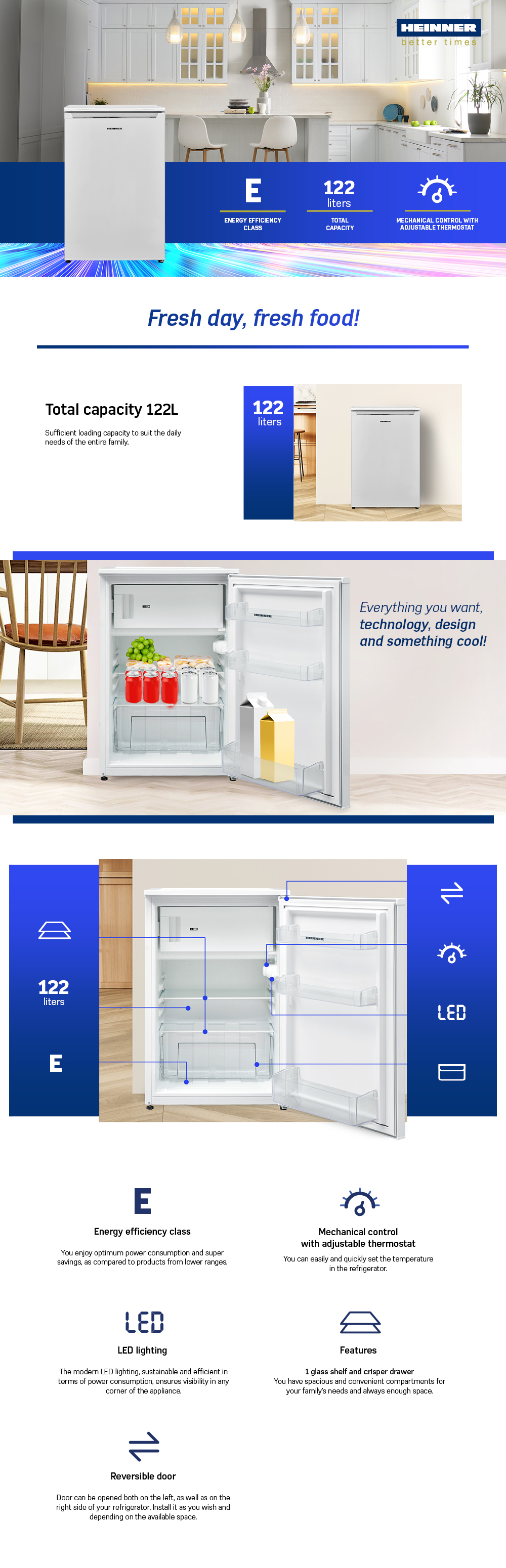 Refrigerator Heinner HF-V122E++, energy efficiency class: E, total capacity: 122L, fridge capacity: 105L, freezer capacity: 17L, mechanical control with adjustable thermostat, LED light, glass shelf, compartment for fruits and vegetables, freezing capacity: 2.6 kg/24h, reversible door, dimensions (WxDxH): 54 x 59.5 x 83.8 cm, color: White with chromed decoration on handle