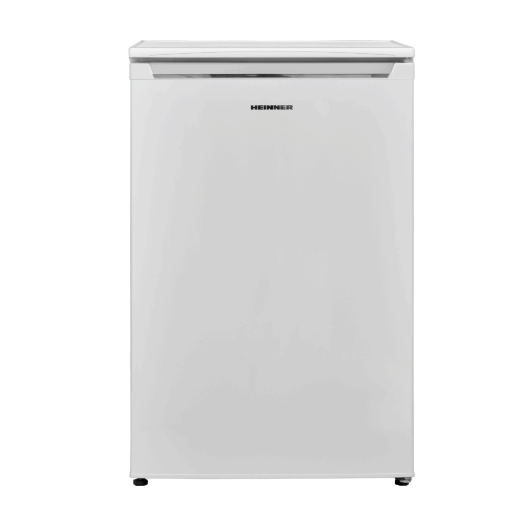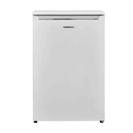 Refrigerator Heinner HF-V122E++, energy efficiency class: E, total capacity: 122L, fridge capacity: 105L, freezer capacity: 17L, mechanical control with adjustable thermostat, LED light, glass shelf, compartment for fruits and vegetables, freezing capacity: 2.6 kg/24h, reversible door, dimensions (WxDxH): 54 x 59.5 x 83.8 cm, color: White with chromed decoration on handle