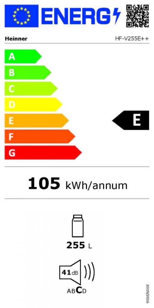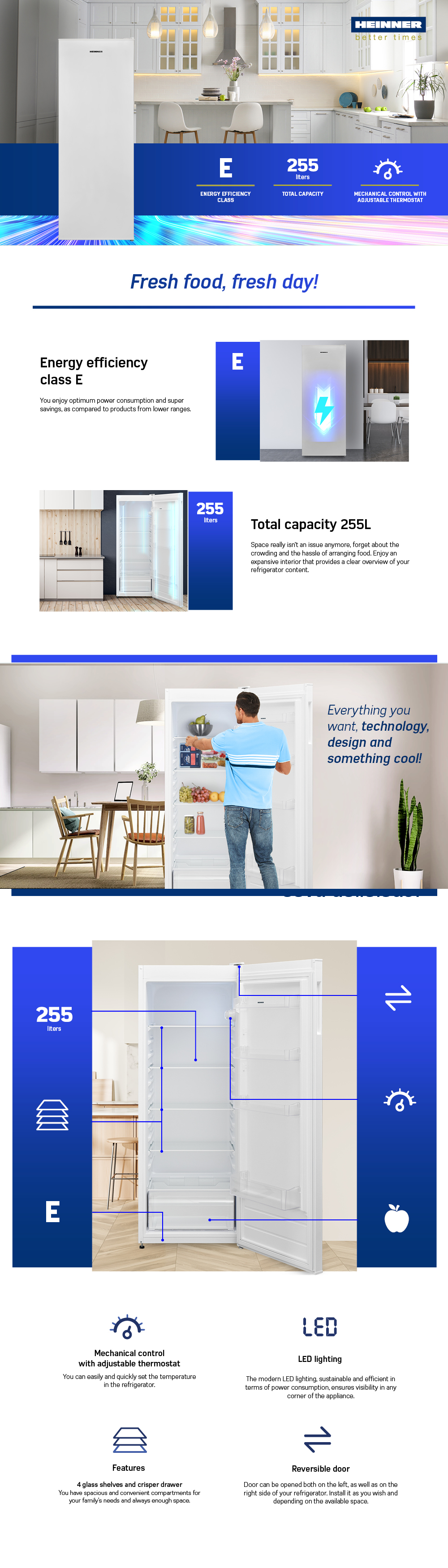 Refrigerator Heinner HF-V255E++, energy efficiency class: E, total capacity: 255L, fridge capacity: 255L, mechanical control with adjustable thermostat, fridge compartment: 4 glass shelves, compartment for fruits and vegetables, LED light, reversible door, dimensions (WxDxH): 54 x 59.5 x 145.5 cm, color: White