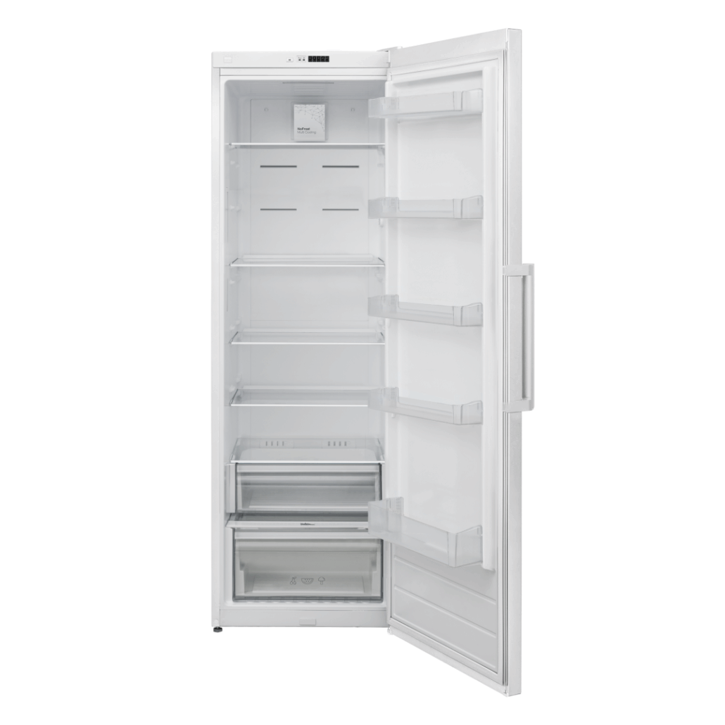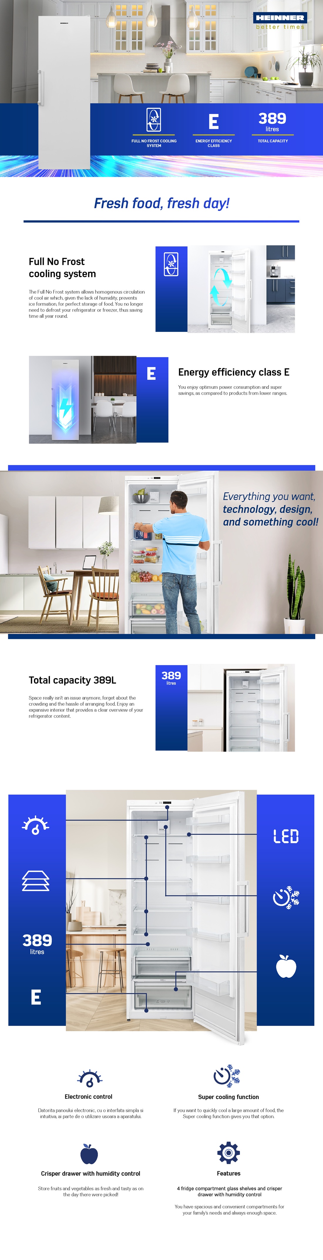 Refrigerator Heinner HF-V401NFE++, Full No Frost, energy efficiency class: E, total capacity: 389L, electronic control, LED light, Super cooling function, 4 glass shelves, crisper drawer with humidity control, Chiller compartment, egg tray, dimensions (WxDxH): 59.5 x 65 x 186 cm, color: White
