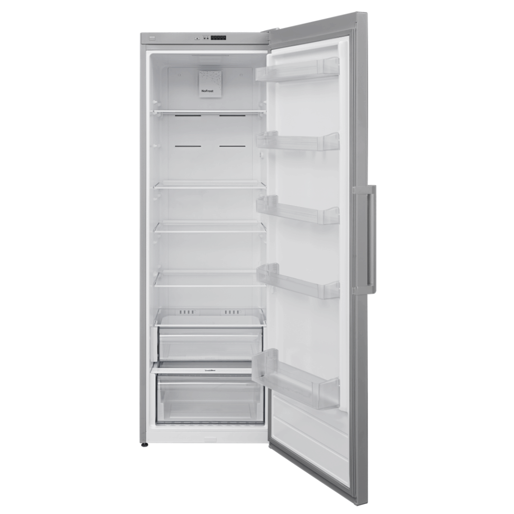 Refrigerator Heinner HF-V401NFSE++, Full No Frost, energy efficiency class: E, total capacity: 389L, electronic control, LED light, Super cooling function, 4 glass shelves, crisper drawer with humidity control, Chiller compartment, egg tray, dimensions (WxDxH): 59.5 x 65 x 186 cm, color: Silver