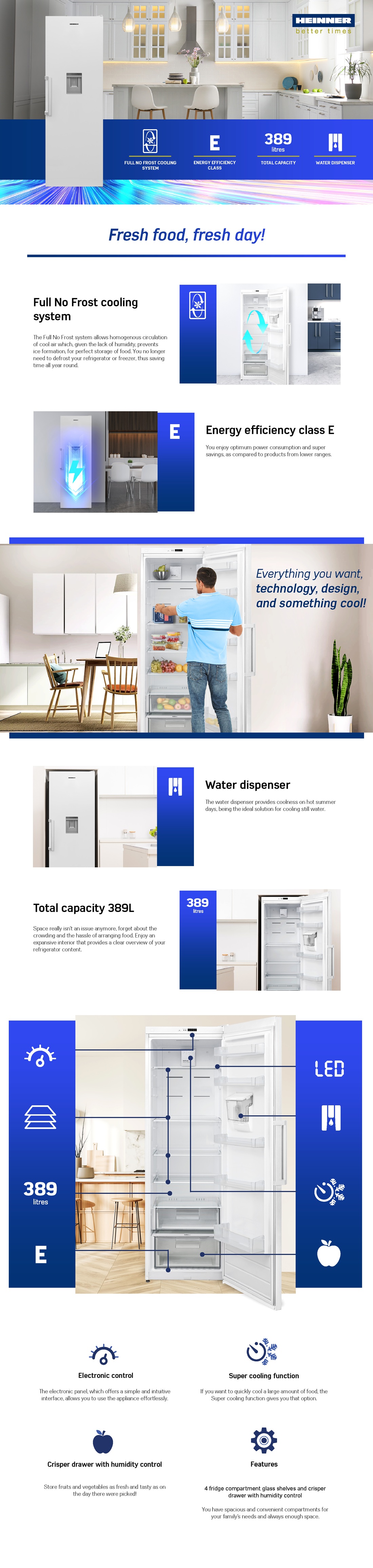 Refrigerator Heinner HF-V401NFWDE++, Full No Frost, water dispenser, energy efficiency class: E, total capacity: 389L, electronical control, LED light, Super cooling function, 4 glass shelves, crisper drawer with humidity control, Chiller compartment, egg tray, dimensions (WxDxH): 59.5 x 65 x 186 cm, color: White