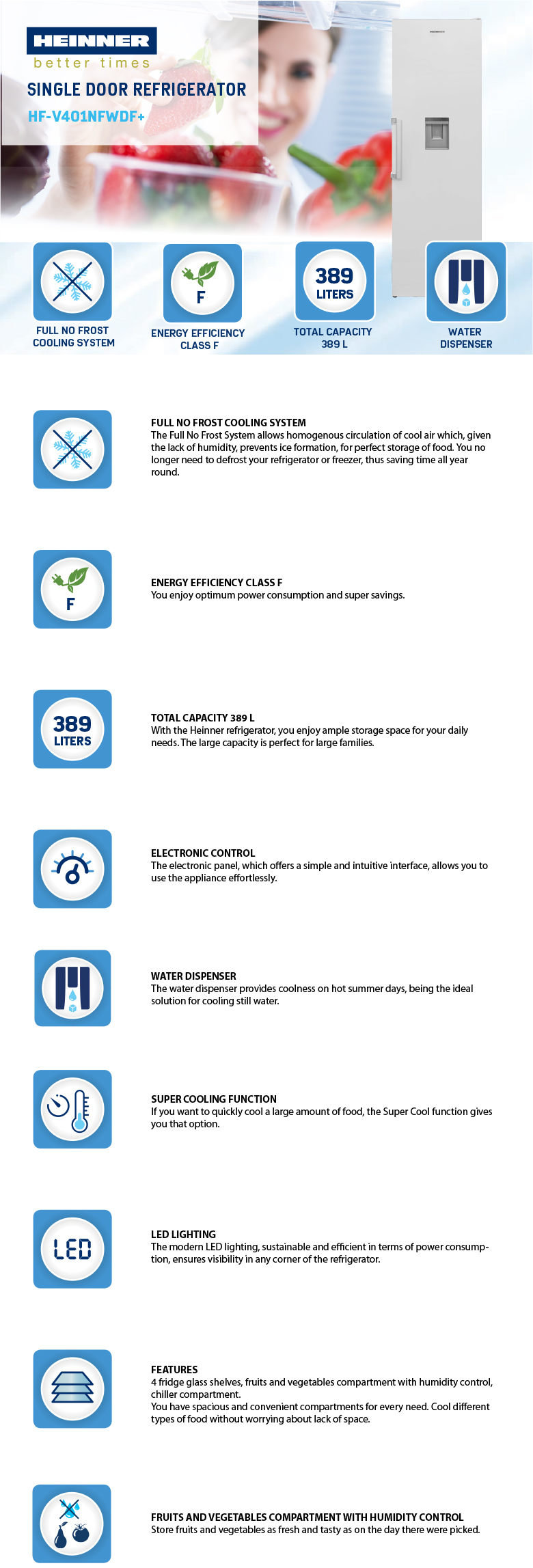 Refrigerator Heinner HF-V401NFWDF+, Full No Frost, water dispenser, energy efficiency class: F, total capacity: 389L, electronical control, LED light, Super cooling function, 4 glass shelves, 1 crisper drawer with humidity control, 1 chiller compartment, egg tray, dimensions (WxDxH): 59.5 x 65 x 186 cm, color: White