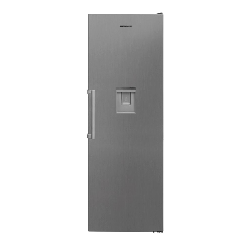Refrigerator Heinner HF-V401NFXWDE++, Full No Frost, water dispenser, energy efficiency class: E, total capacity: 389L, electronical control, LED light, Super cooling function, 4 glass shelves, crisper drawer with humidity control, Chiller compartment, egg tray, dimensions (WxDxH): 59.5 x 65 x 186 cm, color: Inox look