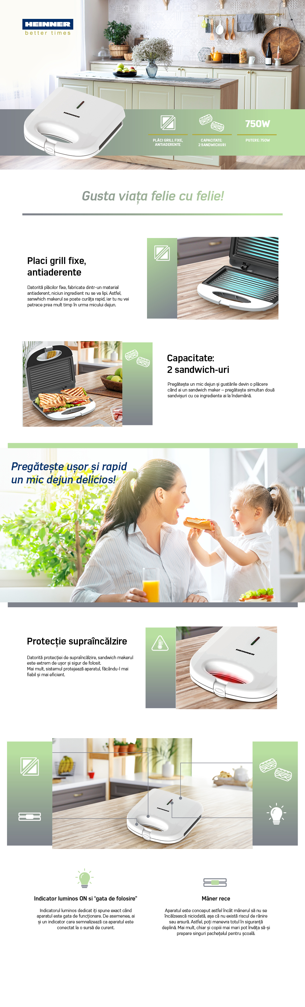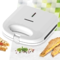 Sandwich maker Heinner SM-K750FGWH, power: 750W, capacity: 2 sandwiches, fixed plates with non-stock coating, light for ON & "Ready" signals, overheating protection, cold touch handle, power cable storage, vertical storage design, white