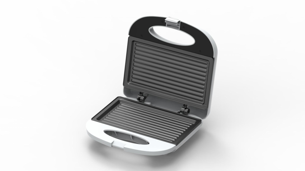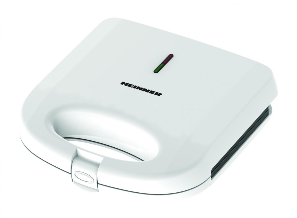 Sandwich maker Heinner SM-K750FGWH, power: 750W, capacity: 2 sandwiches, fixed plates with non-stock coating, light for ON & "Ready" signals, overheating protection, cold touch handle, power cable storage, vertical storage design, white
