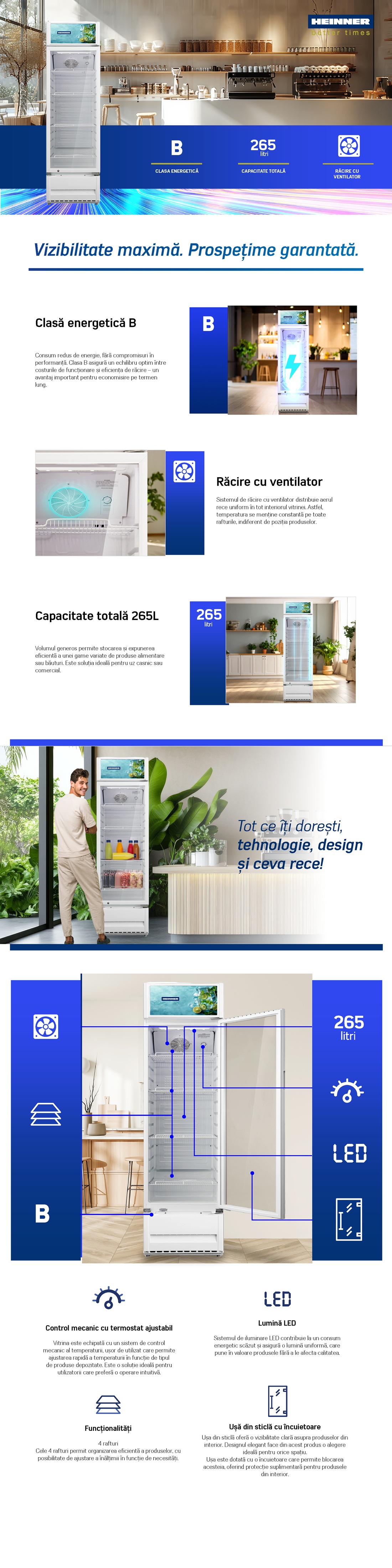 Showcase Heinner HSC-M265WHB, energy efficiency class: B, total capacity: 265L, loading capacity: 306 bottles (330 ml), fan cooling, light box, LED light, mechanical control with adjustable thermostat, 4 glass shelves, glass door with lock, dimensions (WxDxH): 59.5 x 61 x 184.9 cm, color: White