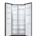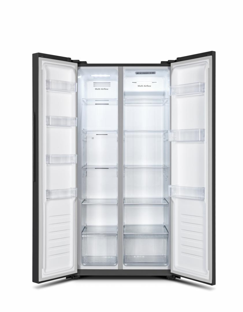 Side by side Heinner HSBS-441NFBKF+, Full No Frost, energy efficiency class: F, electronical control with display inside, total capacity: 441L, fridge net capacity: 266L, freezer net capacity: 175L, LED light, Holiday function, Super freezing function, 4 fridge glass shelves, 1 compartment for fruits and vegetables, 4 freezer shelves, 1 freezer drawer, Egg tray, Ice cube tray, Dimensions (WxDxH): 83.2 x 62.3 x 178 cm, Color: Black