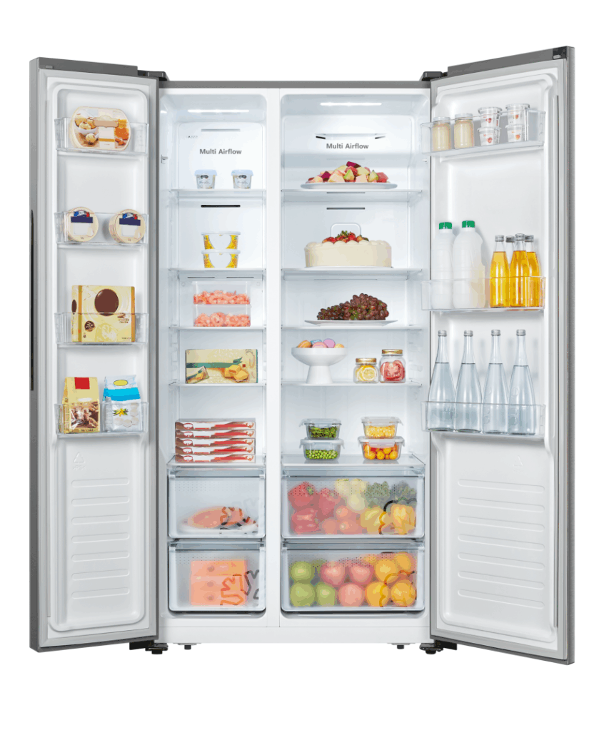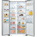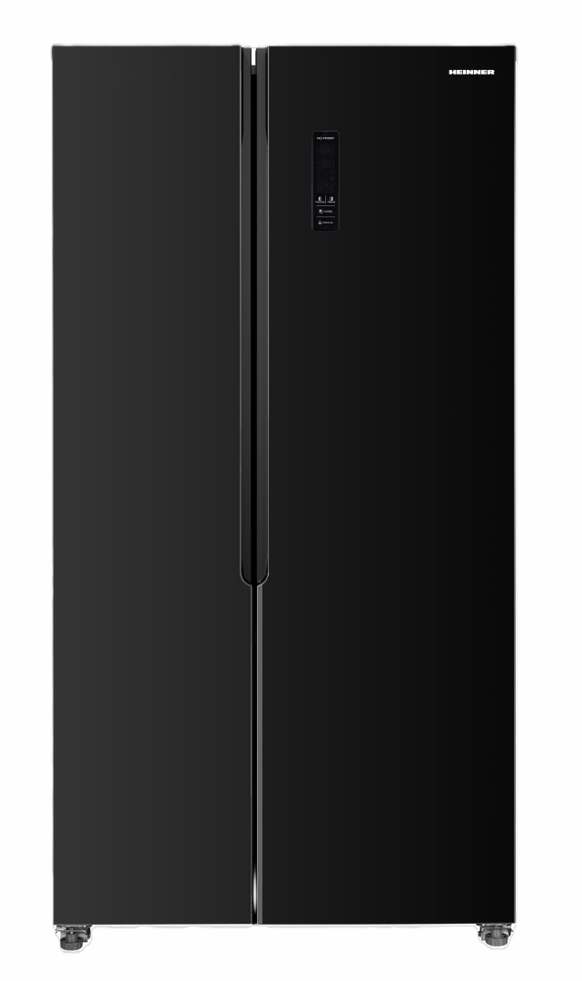 Side by side Heinner HSBS-520NFXF+, Full No Frost, Multi Air-Flow system, Energy efficiency class: F, LED display with touch control, Total capacity: 519L, Fridge net capacity: 334L, Freezer net capacity: 185L, LED light, Super freezing function, “Artificial intelligence” function, Open door alarm, Child lock, 4 fridge glass shelves, 2 compartments for fruits and vegetables, Bottle shelf, 4 freezer shelves, 2 freezer drawers, Dimensions (WxDxH): 91 x 64.3 x 178.6 cm, Color: Inox look
