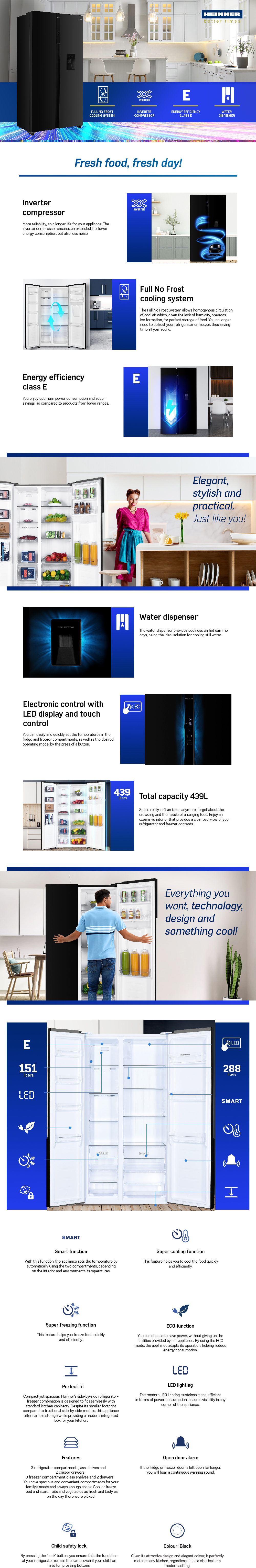 Side by side Heinner HSBS-H439NFBKWDE++, Full No frost, Inverter compressor, Water dispenser, Energy efficiency class: E, LED display with touch control, Total capacity: 439L, Fridge capacity: 288L, Freezer capacity: 151L, LED light, Smart function, ECO Function, Super Cooling function, Super Freezing function, Open door alarm, Child lock, 3 fridge glass shelves, 2 crisper drawers, 3 freezer shelves, 2 freezer drawers, Dimensions (WxDxH): 90 x 59.5 x 177 cm, Color: Black