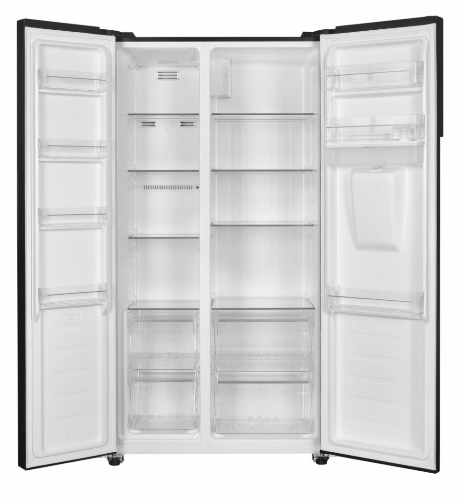 Side by side Heinner HSBS-H439NFBKWDE++, Full No frost, Inverter compressor, Water dispenser, Energy efficiency class: E, LED display with touch control, Total capacity: 439L, Fridge capacity: 288L, Freezer capacity: 151L, LED light, Smart function, ECO Function, Super Cooling function, Super Freezing function, Open door alarm, Child lock, 3 fridge glass shelves, 2 crisper drawers, 3 freezer shelves, 2 freezer drawers, Dimensions (WxDxH): 90 x 59.5 x 177 cm, Color: Black