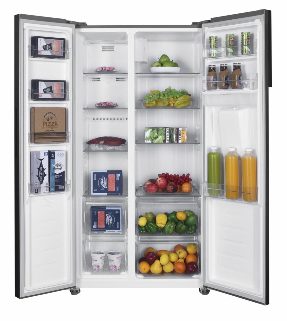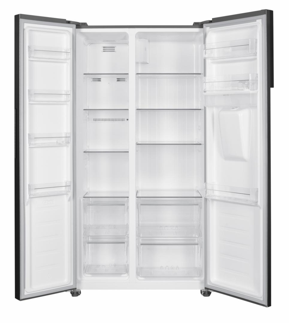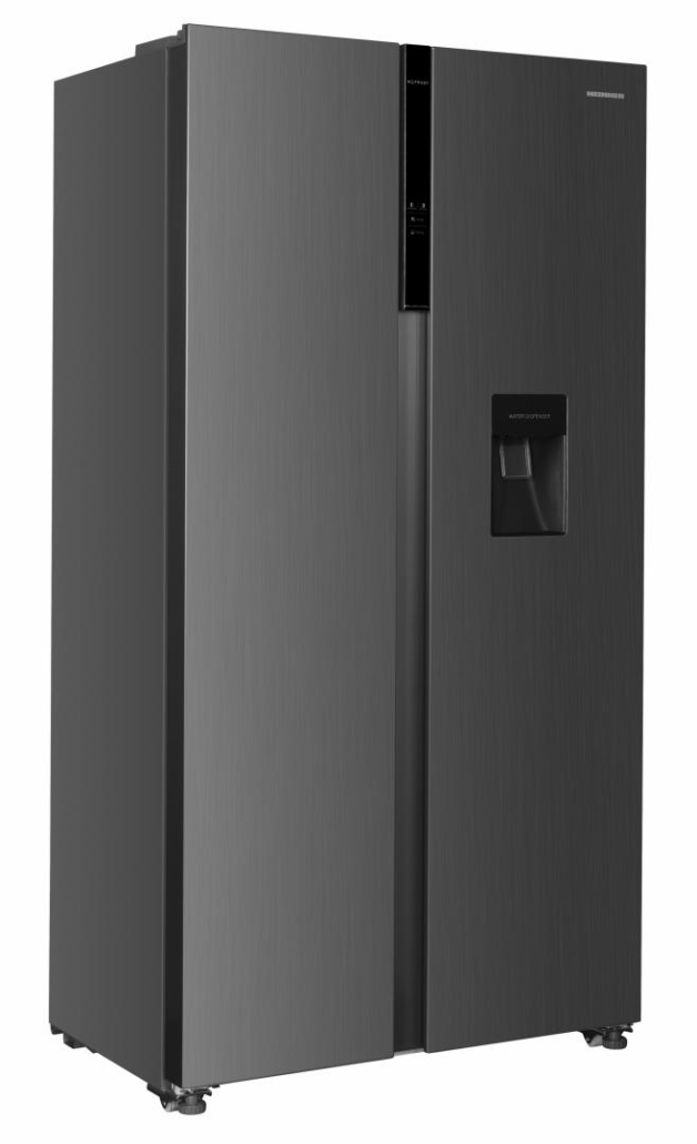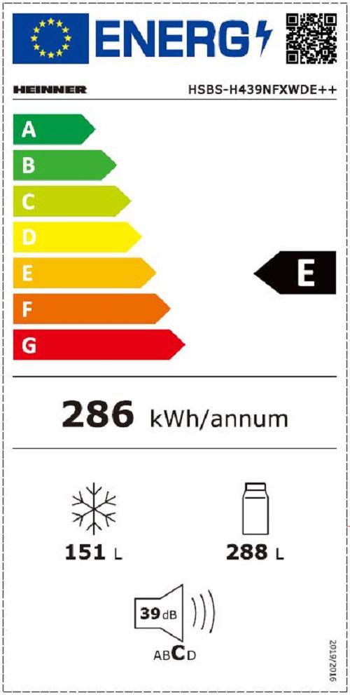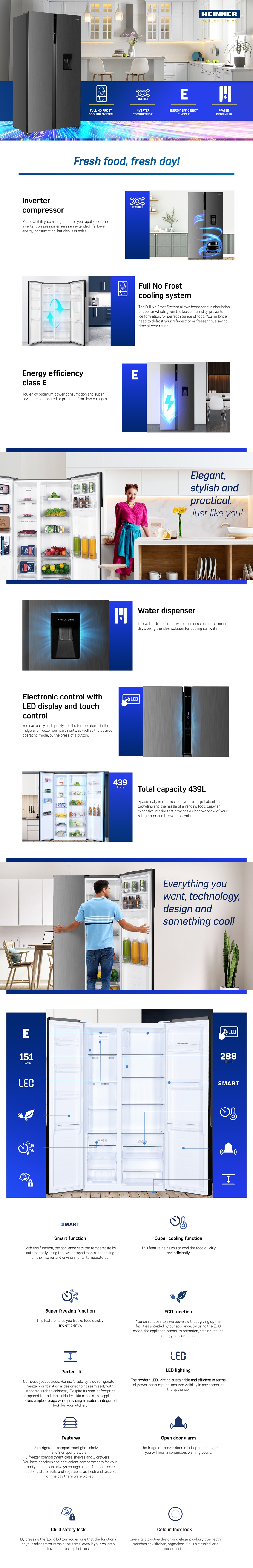 Side by side Heinner HSBS-H439NFXWDE++, Full No frost, Inverter compressor, Water dispenser, Energy efficiency class: E, LED display with touch control, Total capacity: 439L, Fridge capacity: 288L, Freezer capacity: 151L, LED light, Smart function, ECO Function, Super Cooling function, Super Freezing function, Open door alarm, Child lock, 3 fridge glass shelves, 2 crisper drawers, 3 freezer shelves, 2 freezer drawers, Dimensions (WxDxH): 90 x 59.5 x 177 cm, Color: Inox look