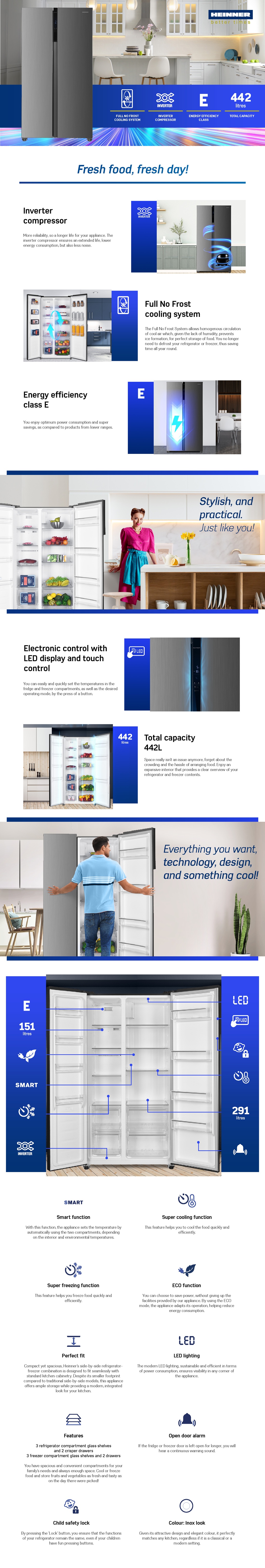 Side by side Heinner HSBS-H442NFXE++, Full No frost, Inverter compressor, Energy efficiency class: E, LED display with touch control, Total capacity: 442L, Fridge capacity: 291L, Freezer capacity: 151L, LED light, Smart function, ECO Function, Super Cooling function, Super Freezing function, Open door alarm, Child lock, 3 fridge glass shelves, 2 compartment for fruits and vegetables, 3 freezer glass shelves, 2 freezer drawers, Dimensions (WxDxH): 90.5 x 59.5 x 177 cm, Color: Inox look