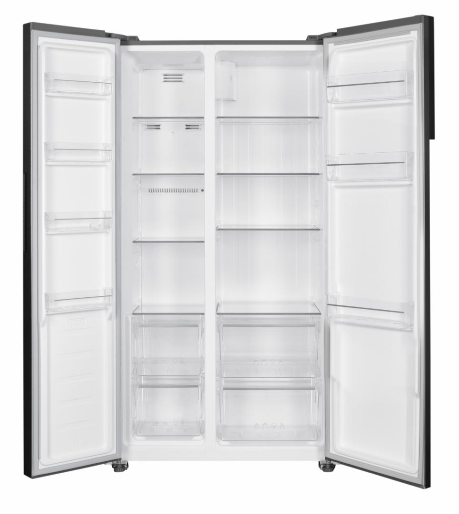 Side by side Heinner HSBS-H442NFXE++, Full No frost, Inverter compressor, Energy efficiency class: E, LED display with touch control, Total capacity: 442L, Fridge capacity: 291L, Freezer capacity: 151L, LED light, Smart function, ECO Function, Super Cooling function, Super Freezing function, Open door alarm, Child lock, 3 fridge glass shelves, 2 compartment for fruits and vegetables, 3 freezer glass shelves, 2 freezer drawers, Dimensions (WxDxH): 90.5 x 59.5 x 177 cm, Color: Inox look