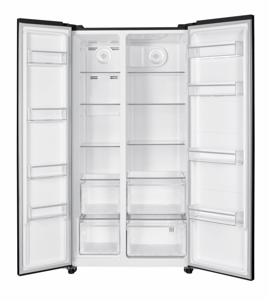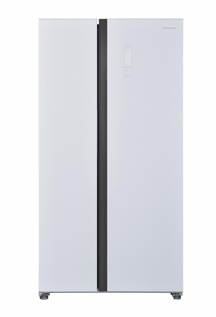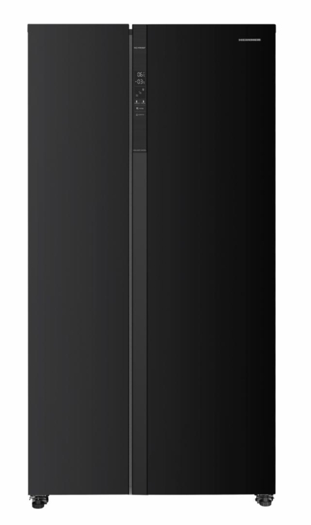 Side by side Heinner HSBS-HM532NFBKE++, Full No frost, Inverter compressor, energy efficiency class: E, LED display with touch control, total capacity: 532L, fridge capacity: 347L, freezer capacity: 185L, LED light, Smart function, ECO function, Super Cooling function, Super Freezing function, open door alarm, child lock, 3 fridge glass shelves, 2 compartment for fruits and vegetables, 3 freezer glass shelves, 2 freezer drawers, water dispenser capacity: 2.5L, dimensions (WxDxH): 90 x 66 x 177 cm, color: Black