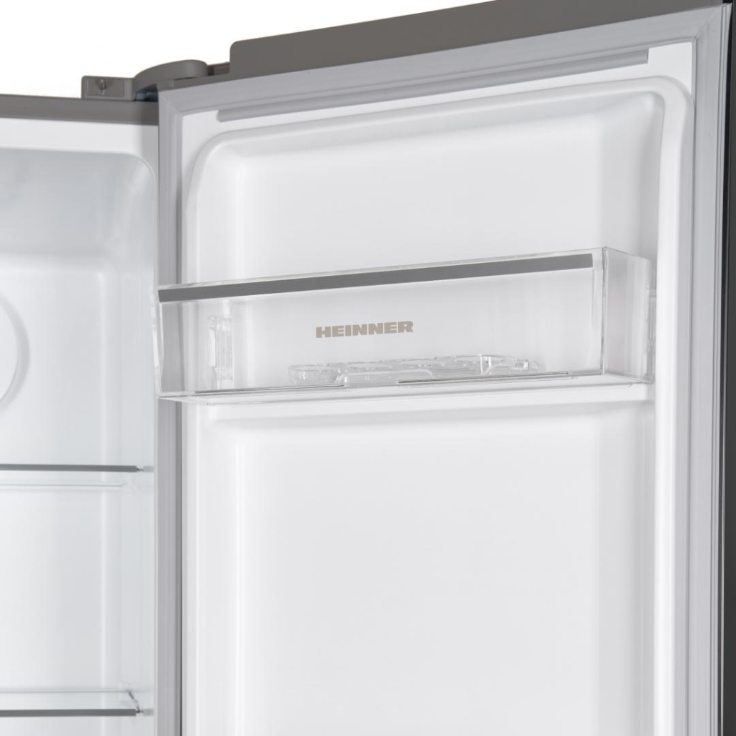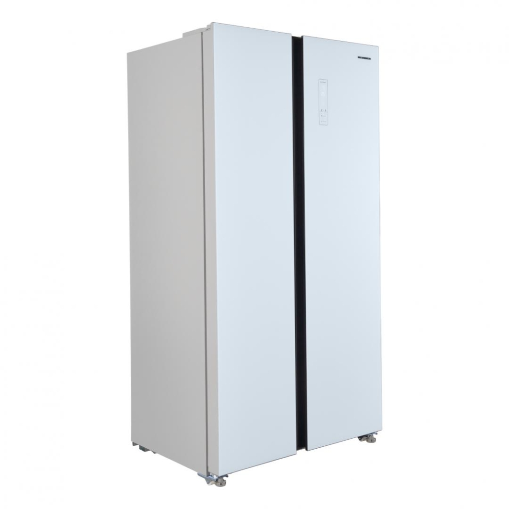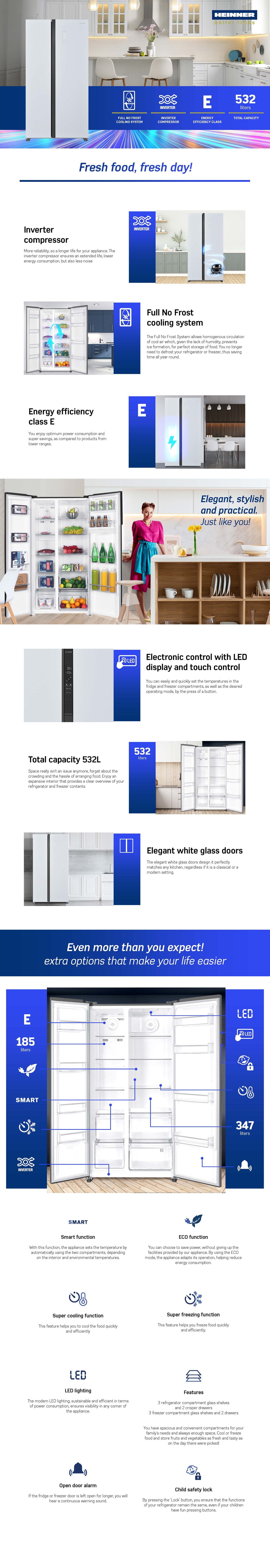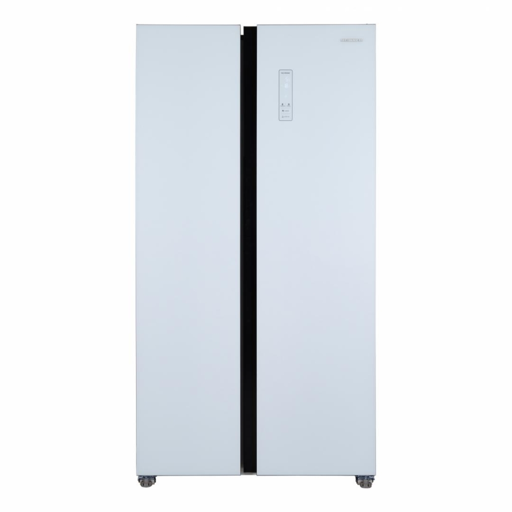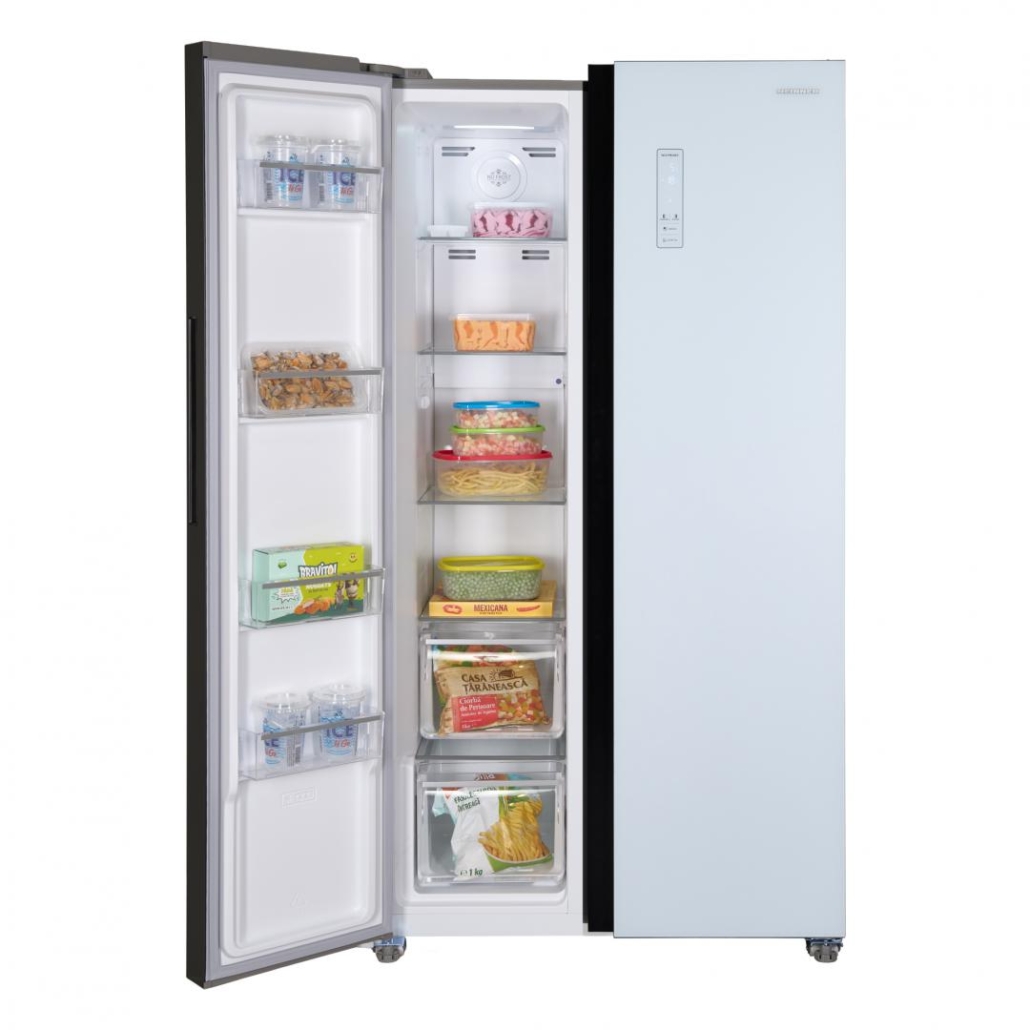 Side by side Heinner HSBS-HM532NFGWHE++, Full No Frost,, energy efficiency class: E, Inverter compressor, White Glass doors, LED display with touch control, total capacity: 532L, fridge capacity: 347L, freezer capacity: 185L, LED light, SMART function, ECO Function, Super cooling function, Super freezing function, open door alarm, child lock, 3 fridge glass shelves, 2 compartment for fruits and vegetables , 3 freezer glass shelves, 2 freezer drawers, dimensions (WxDxH): 90 x 66 x 177 cm, color: White glass doors/Grey cabinet