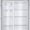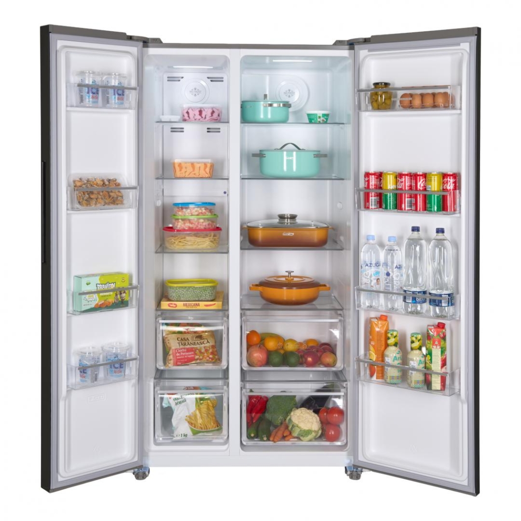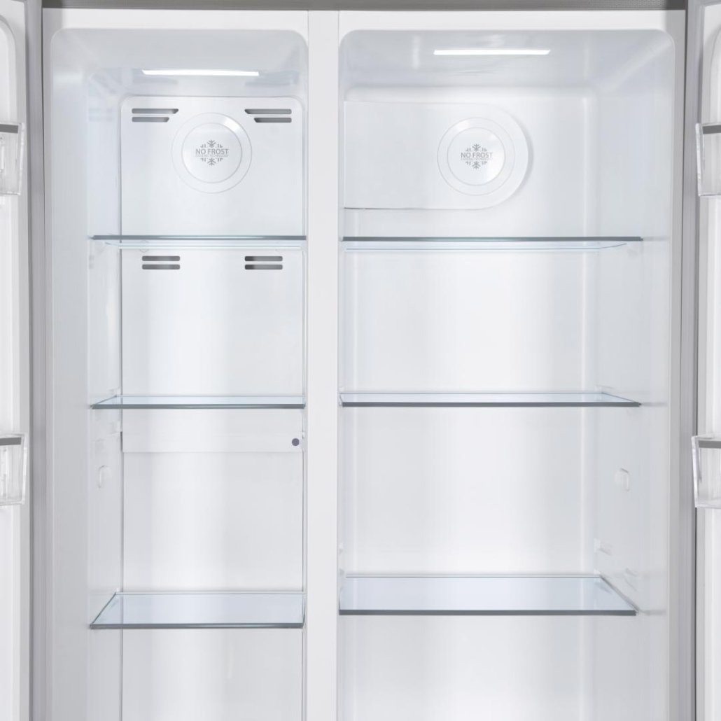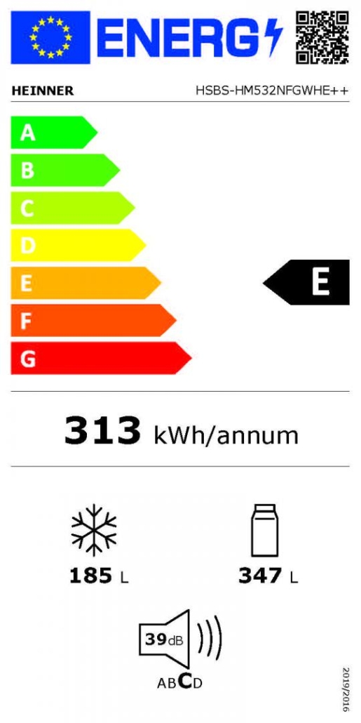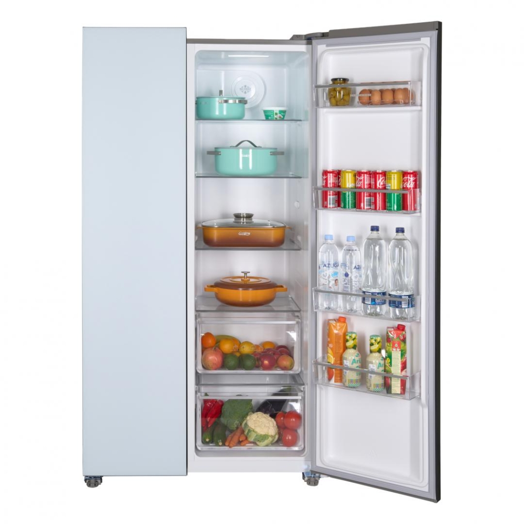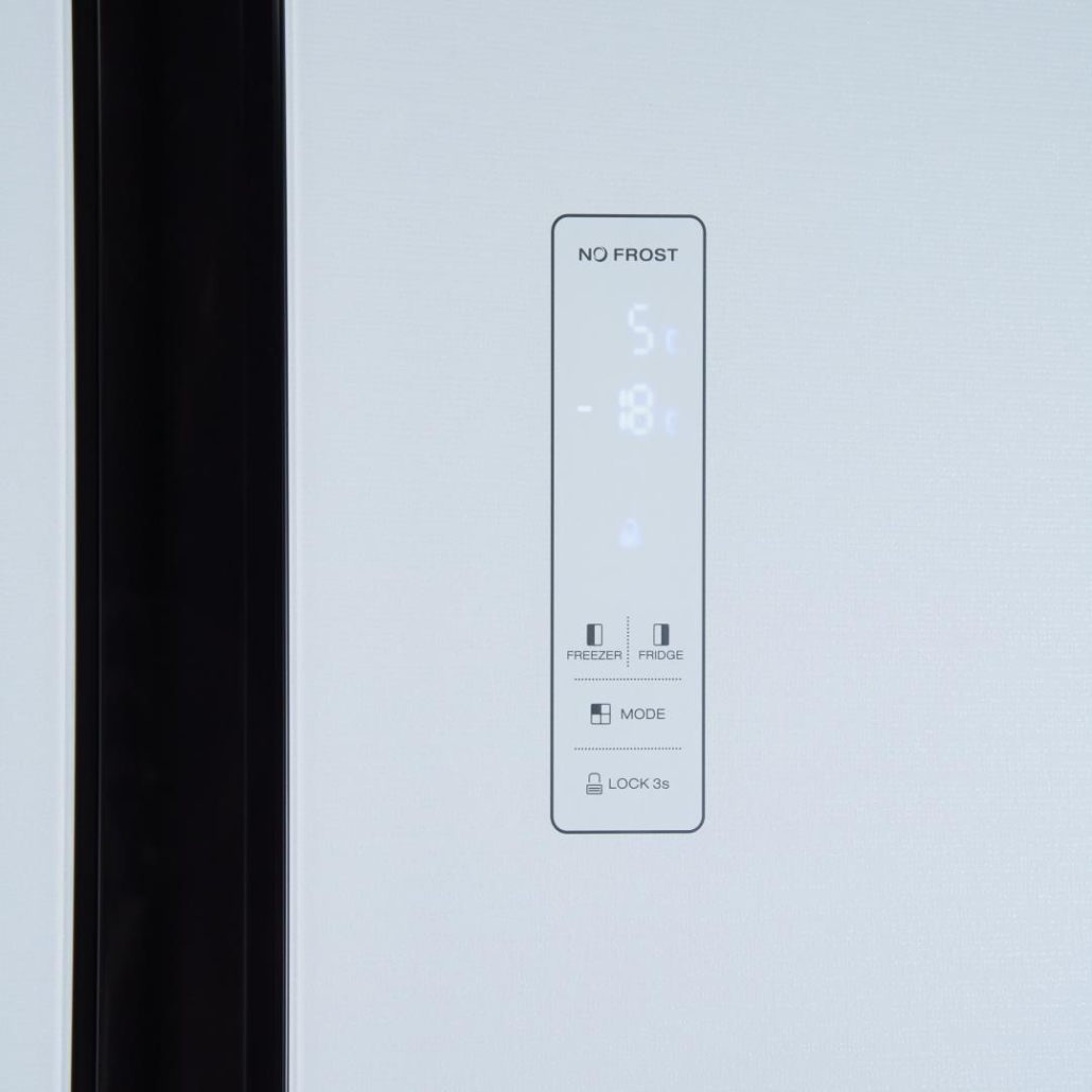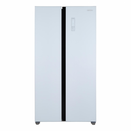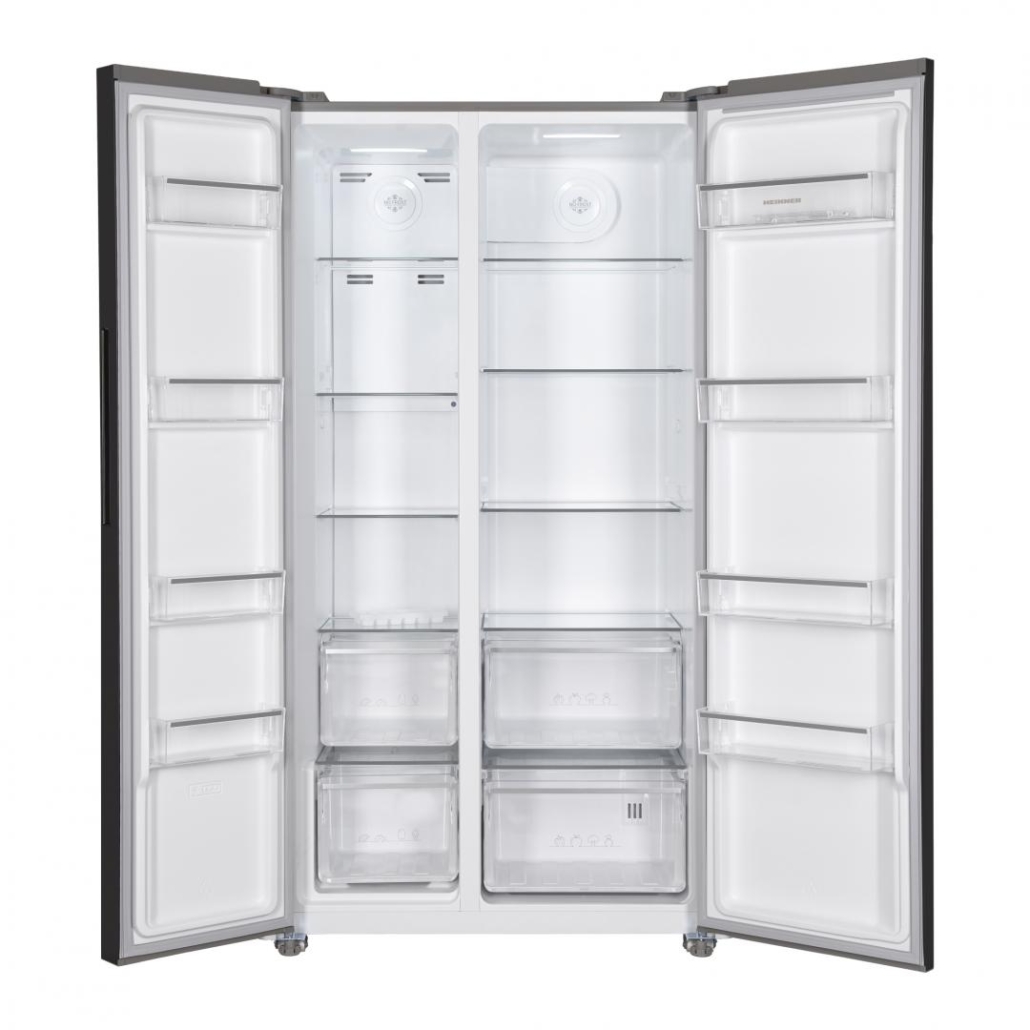 Side by side Heinner HSBS-HM532NFGWHE++, Full No Frost,, energy efficiency class: E, Inverter compressor, White Glass doors, LED display with touch control, total capacity: 532L, fridge capacity: 347L, freezer capacity: 185L, LED light, SMART function, ECO Function, Super cooling function, Super freezing function, open door alarm, child lock, 3 fridge glass shelves, 2 compartment for fruits and vegetables , 3 freezer glass shelves, 2 freezer drawers, dimensions (WxDxH): 90 x 66 x 177 cm, color: White glass doors/Grey cabinet