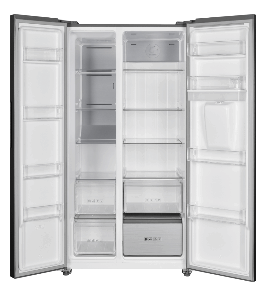 Side by side Heinner HSBS-HM592NFDXWDE++, Full No Frost, total capacity: 592L, fridge capacity: 367L, freezer capacity: 225L, energy efficiency class: E, Inverter compressor, LED display with touch control, water dispenser, Multi Air-Flow system, InoxCool technology, MultiClimate system - 3 zones with independent temperature control (fridge, freezer, convertible zone), Holiday function, ECO function, Super Freezing function, fridge compartment: 3 glass shelves, compartment for fruits and vegetables, fridge/freezer convertible compartment - temperatures between 5 °C and -3 °C, fridge/freezer convertible zone capacity: 33L, freezer compartment: 3 glass shelves, 2 drawers, water dispenser capacity: 3L, LED light, open door alarm, child lock, dimensions (WxDxH): 90 x 73 x 177 cm, color: Dark Inox