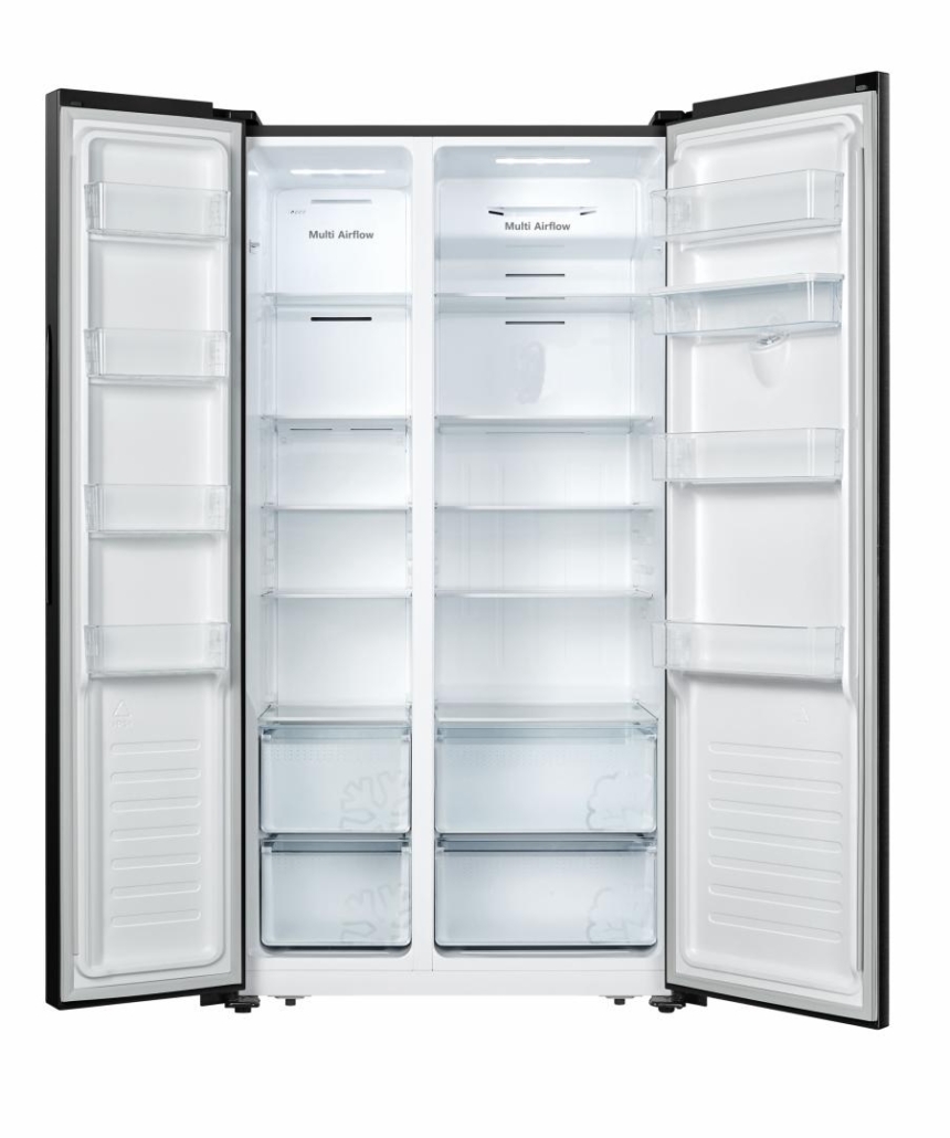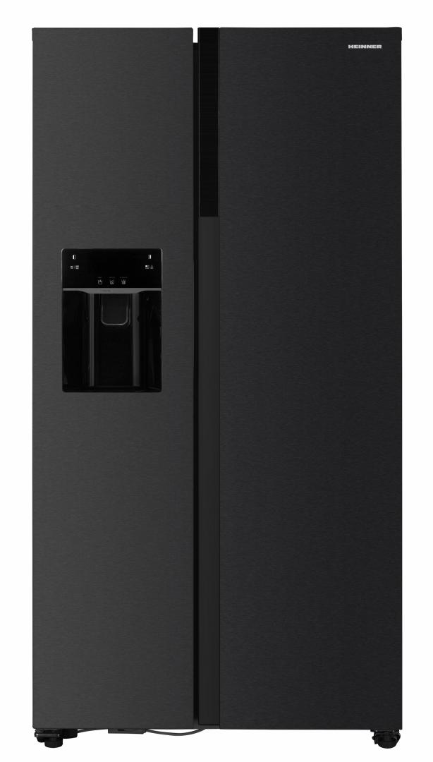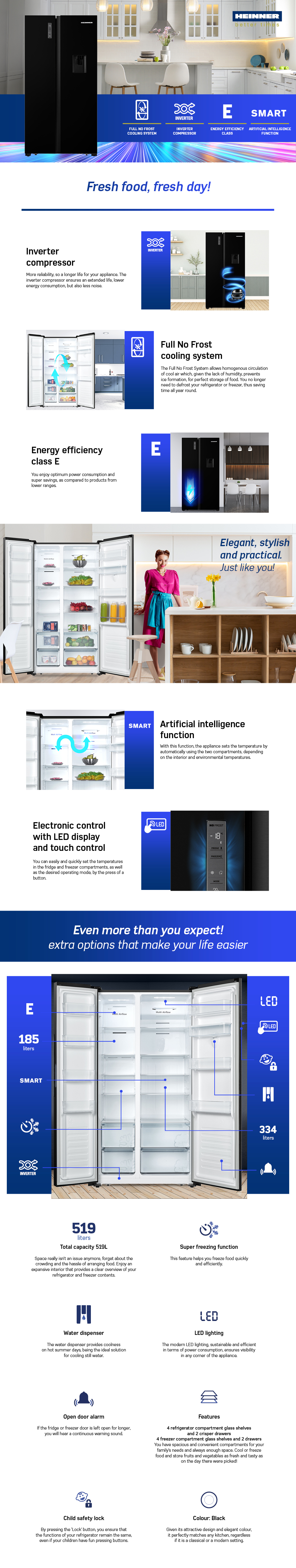 Side by side Heinner HSBS-HS519NFBKWDE++, Full No Frost, Multi Air-Flow System, Inverter compressor, energy efficiency class: E, water dispenser, LED display with touch control, total capacity: 519L, fridge capacity: 334L, freezer capacity: 185L, LED light, Super freezing function, Artificial Intelligence function, open door alarm, child lock, 4 fridge glass shelves, 2 compartment for fruits and vegetables, 4 freezer glass shelves, 2 freezer drawers, water dispenser capacity: 3L, dimensions (WxDxH): 91 x 64.3 x 178.6 cm, color: Black