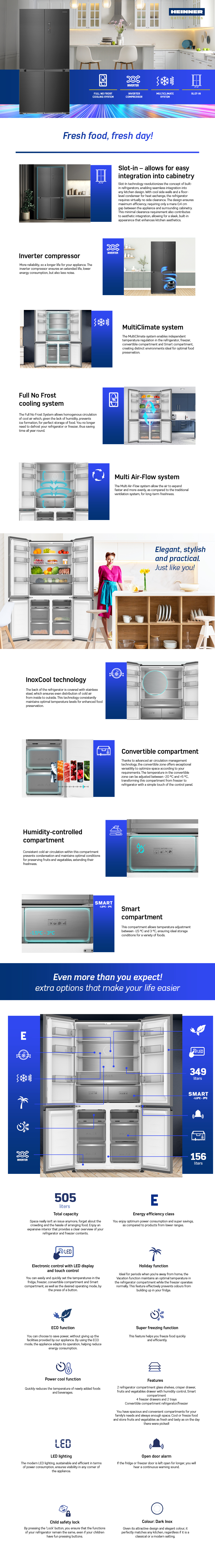 Side by side Multidoor Heinner HSBS-HM505MDSINFDXE++, Slot-in – allows incorporation into kitchen furniture, Total No Frost, total capacity: 505L, fridge capacity: 349L, freezer capacity: 156L, energy efficiency class: E, Inverter compressor, LED display with touch control, Multi Air-Flow system, InoxCool technology, MultiClimate system - 4 zones with independent temperature control, "Holiday“ function, ECO function, Super cooling function, Super freezing function, fridge compartment: 2 glass shelves, compartment for fruits and vegetables, compartment with humidity control, Smart zone – temperatures between -3 °C and +3 °C, freezer compartment: 4 drawers, 2 pizza trays, fridge/freezer convertible compartment – temperatures between -20 °C and +5 °C, convertible compartment capacity: 80L, LED light, open door alarm, Child lock, dimensions (WxDxH): 90.5 x 59.7 x 190.2 cm, color: Dark inox