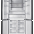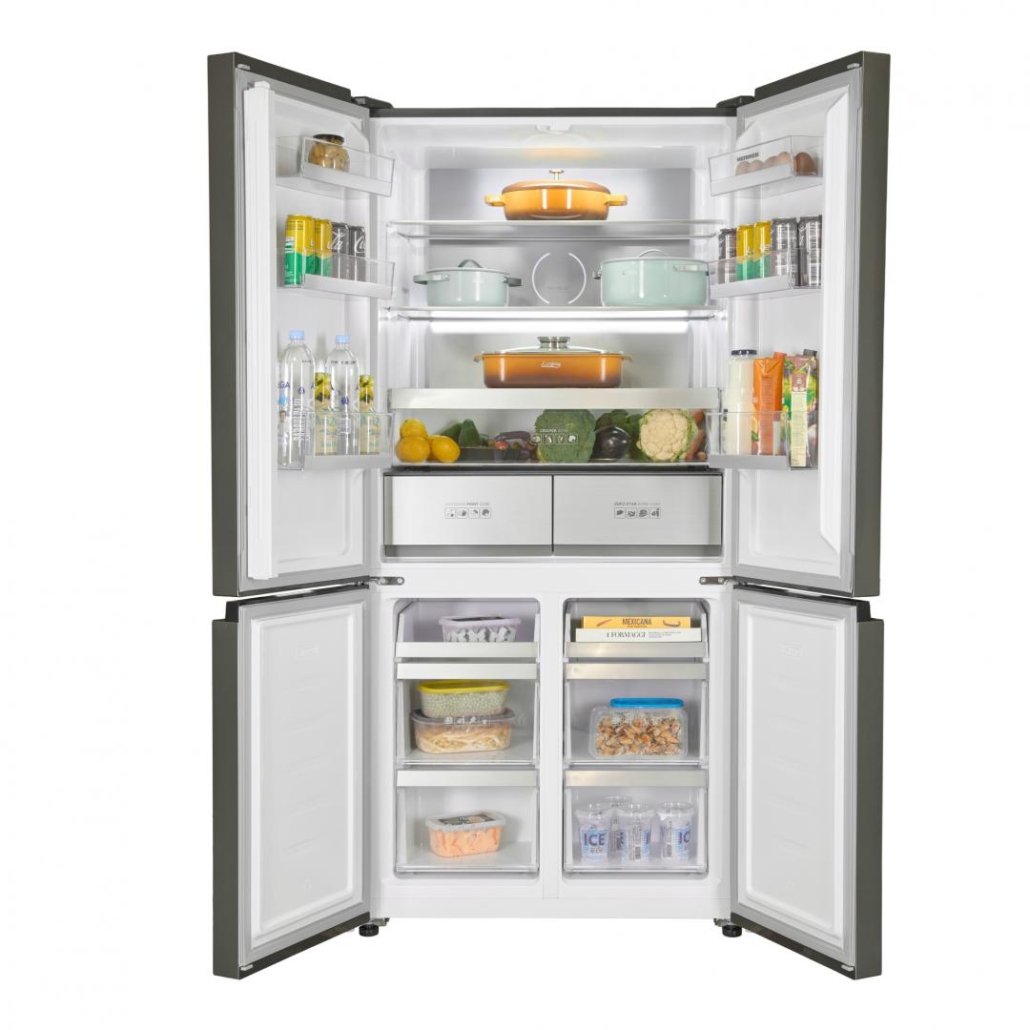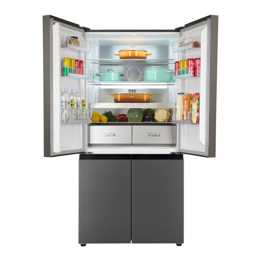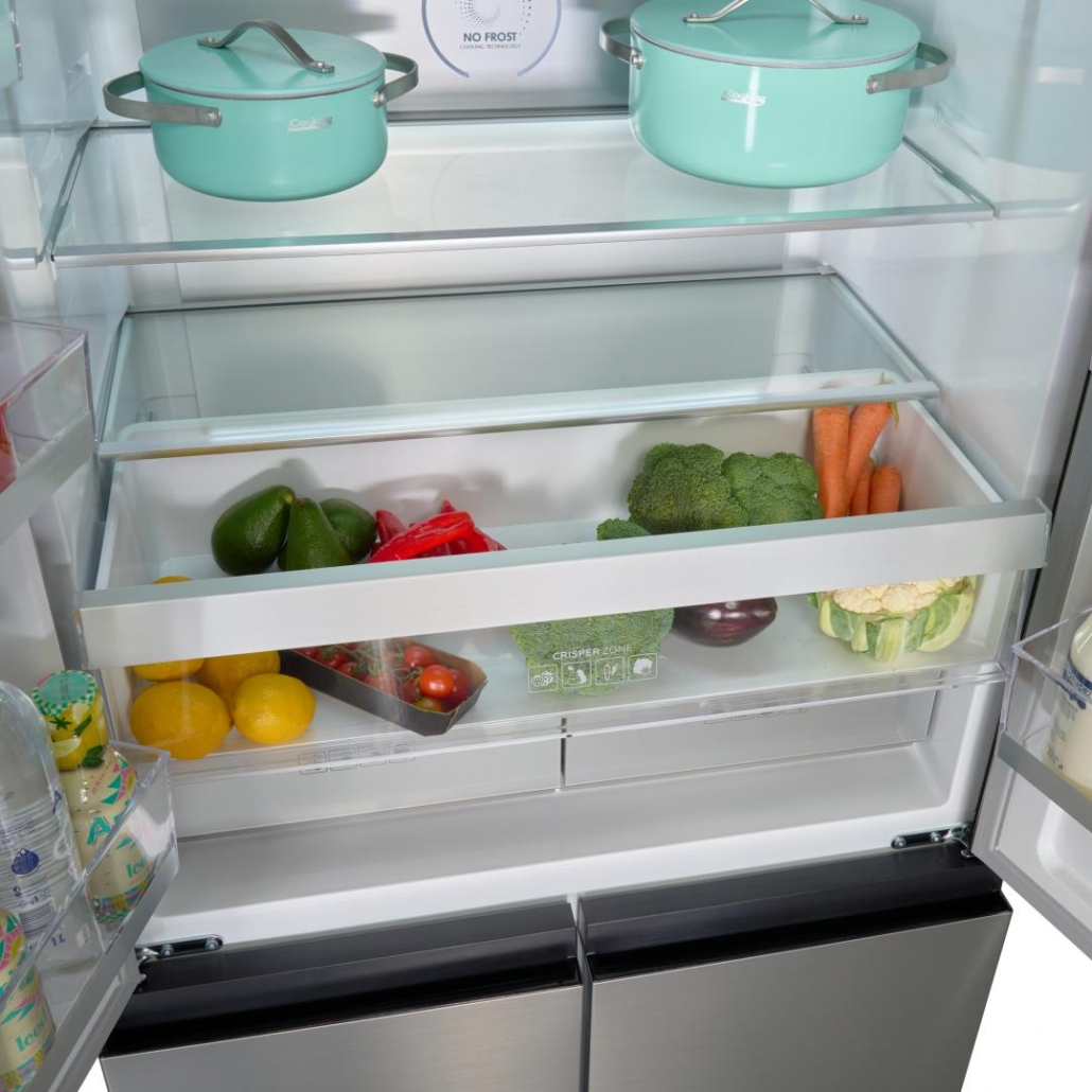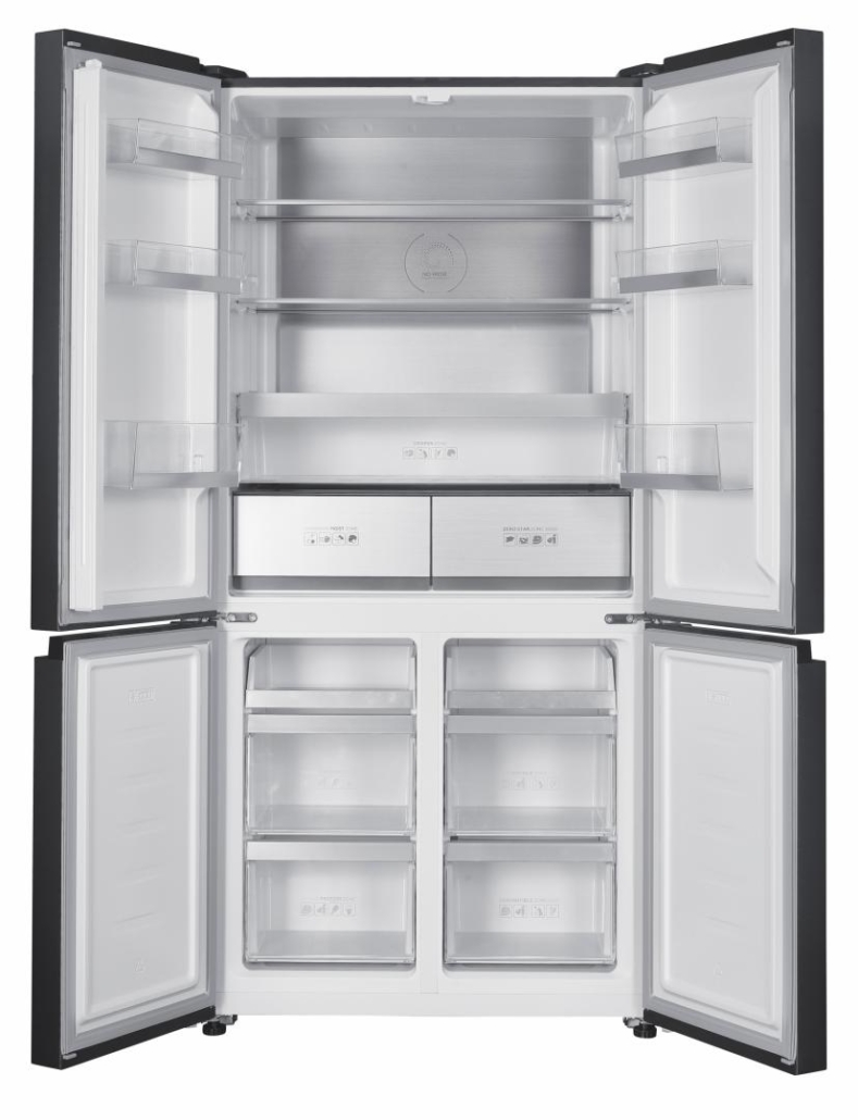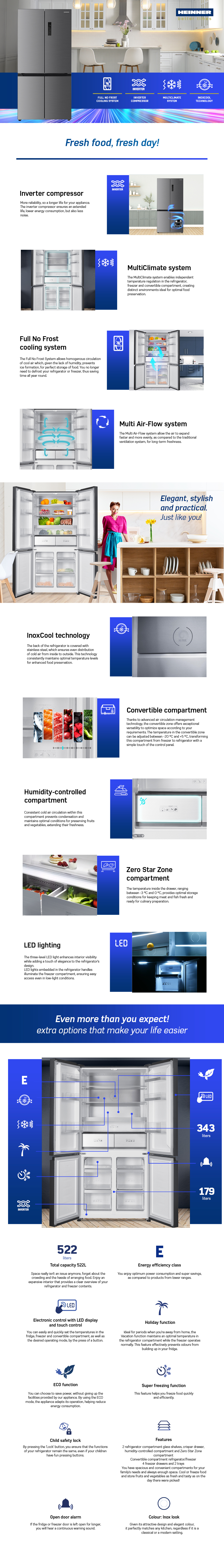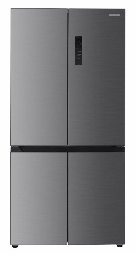 Side by side Multidoor Heinner HSBS-HM522MDNFXE++, Full No Frost, total capacity: 522L, fridge capacity: 343L, freezer capacity: 179L, energy efficiency class: E, Inverter compressor, LED display with touch control, Multi Air-Flow system, InoxCool technology, MultiClimate system - 3 zones with independent temperature control (fridge, freezer, convertible zone), Holiday function, ECO function, Super freezing function, fridge compartment: 2 glass shelves, compartment for fruits and vegetables, compartment with humidity control, Zero-star zone - temperatures between -3 °C and 0 °C, freezer compartment: 4 drawers, 2 pizza trays, fridge /freezer convertible zone - temperatures between -20 °C and +5 °C, fridge/freezer convertible zone capacity: 82L, LED light, open door alarm, Child lock, dimensions (WxDxH): 90.9 x 69 x 190 cm, color: Inox look