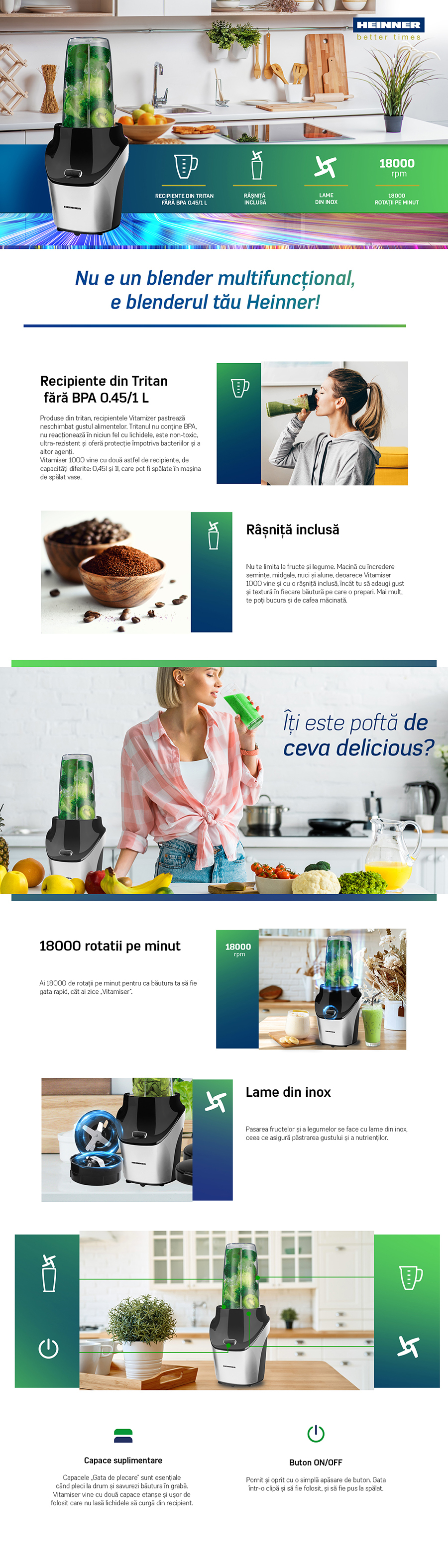 Sport blender Heinner HSB-T1000SS, 1000W, 18000RPM, Tritan bowl BPA free 0.45L, Tritan bowl BPA free 1L, grinder included, stainless steel blades, 1 lid "ready to go", 2 additional lids, ON/OFF button, black