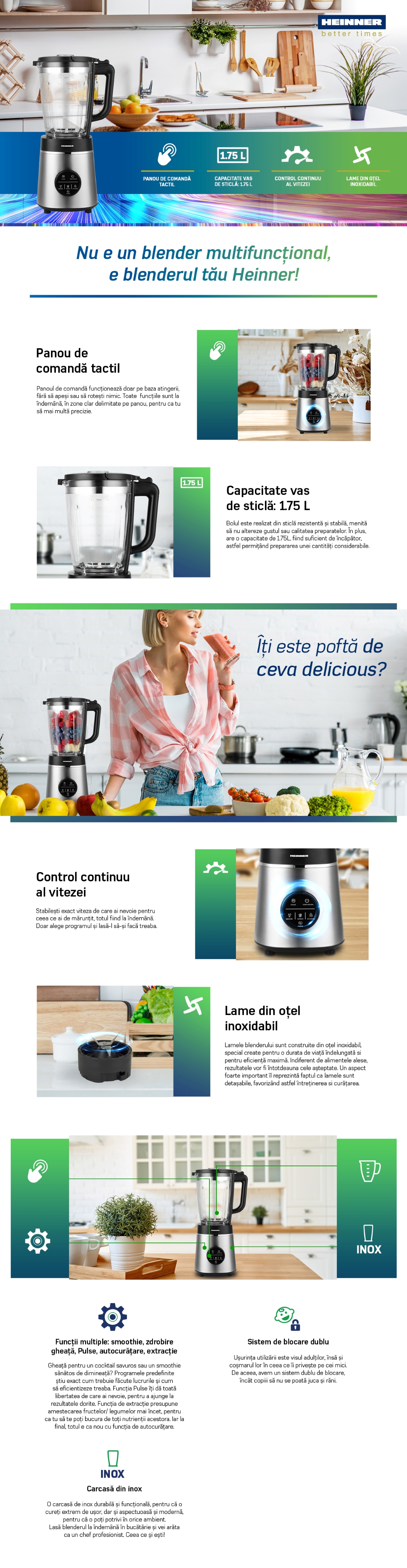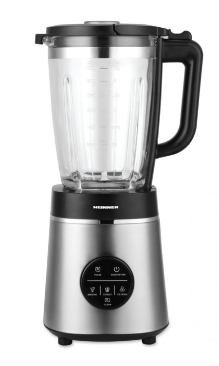 Stand blender Heinner Bette Noir HBL-D1400SS, Touch control, 1.75 L glass bowl capacity, stepless speed control, multifunction: smoothie, ice crush, Pulse, self-clean, extract, double safety lock, stainless steel blades, stainless steel base housing, noise level: 85dB, power: 1400W