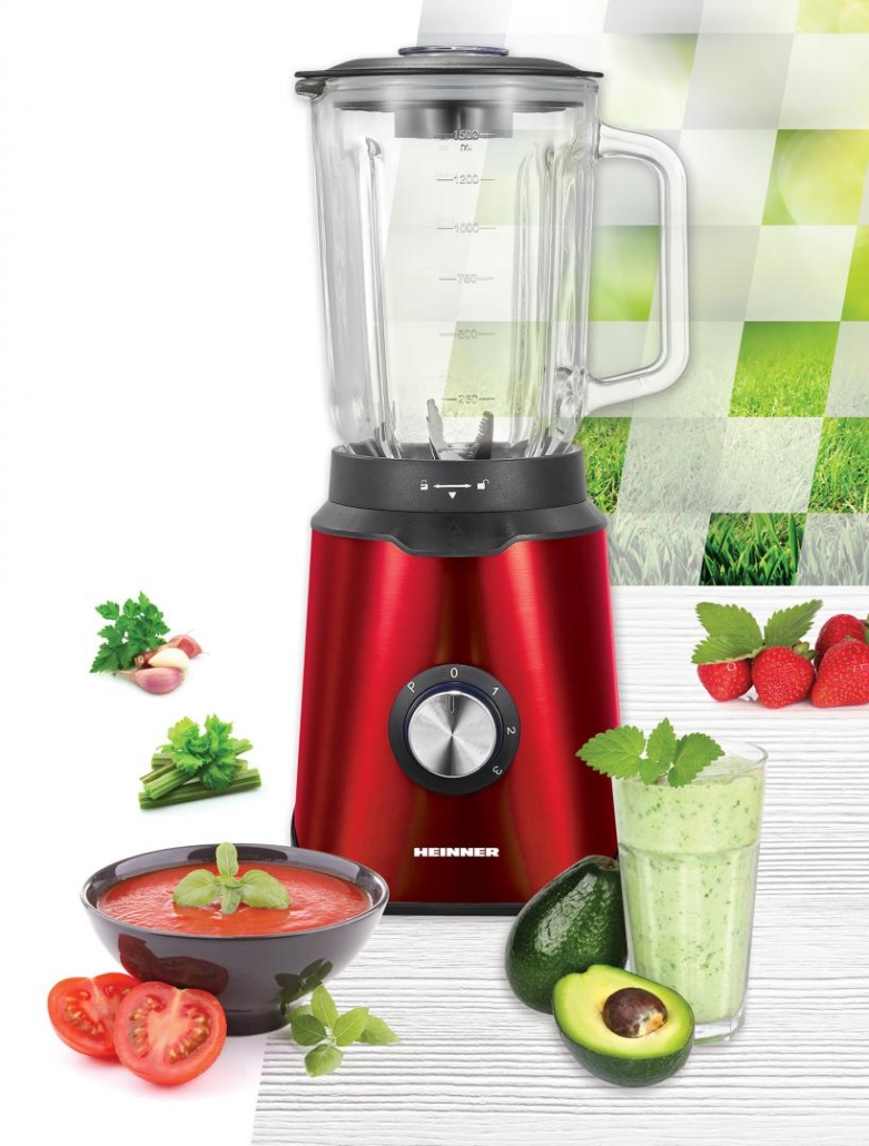 Stand blender Heinner Vitality HBL-1000RED, 1000W, glass bowl capacity: 1.5l, 6 stainless steel blades, 3 speeds + Pulse, Led light, overheating protection, safety lock system, red stainless steel housing, red pearl