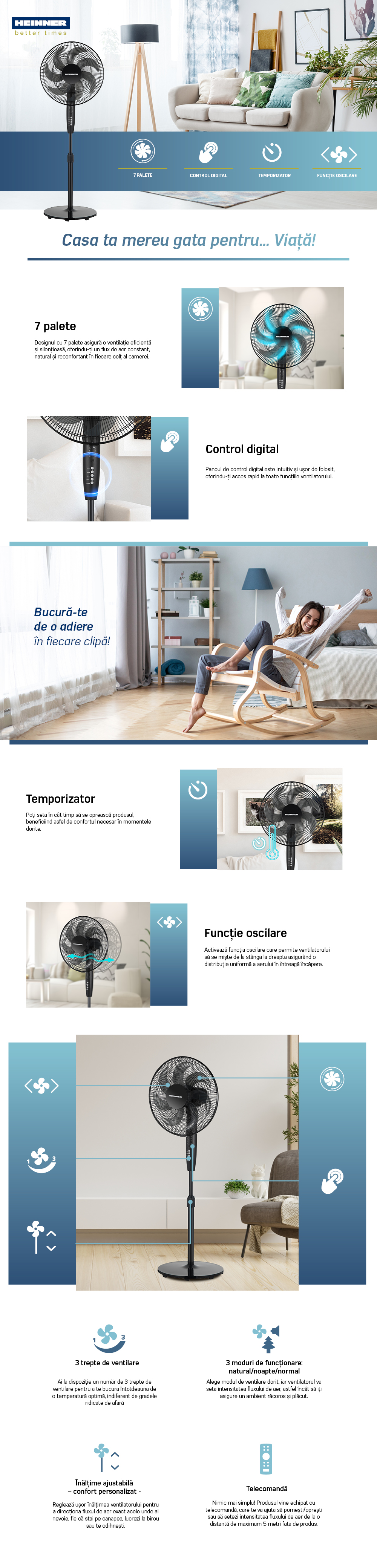 Stand fan HEINNER HSF-M750D-BK, 7 blades, 7H timer, digital control, remote control, 85° horizontal oscillation, 3 speeds, 3 wind modes: natural /sleep /normal; adjustable height, maximum height: 130 cm, power: 50W, black