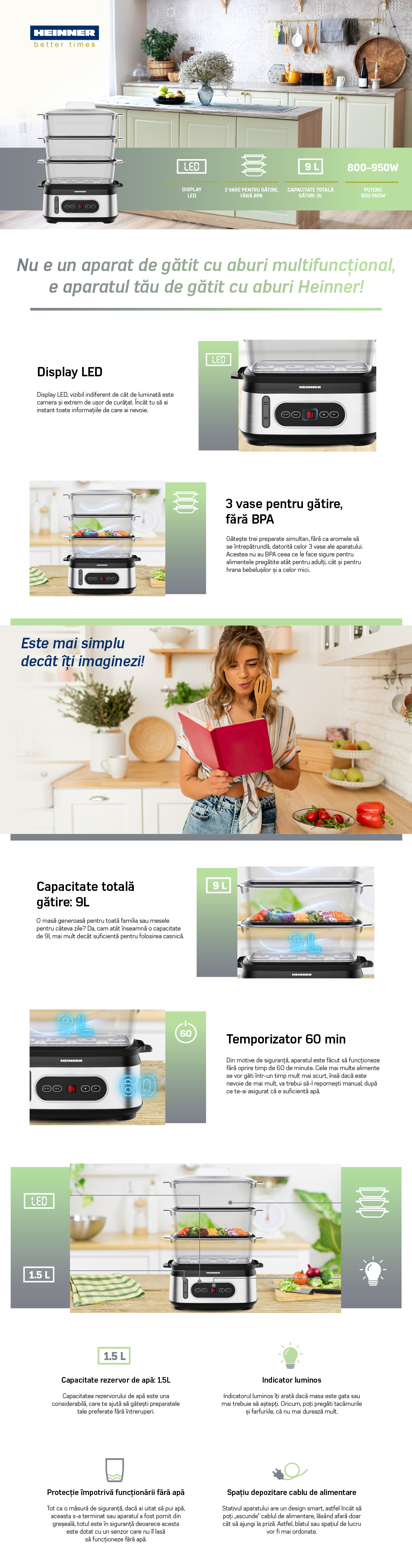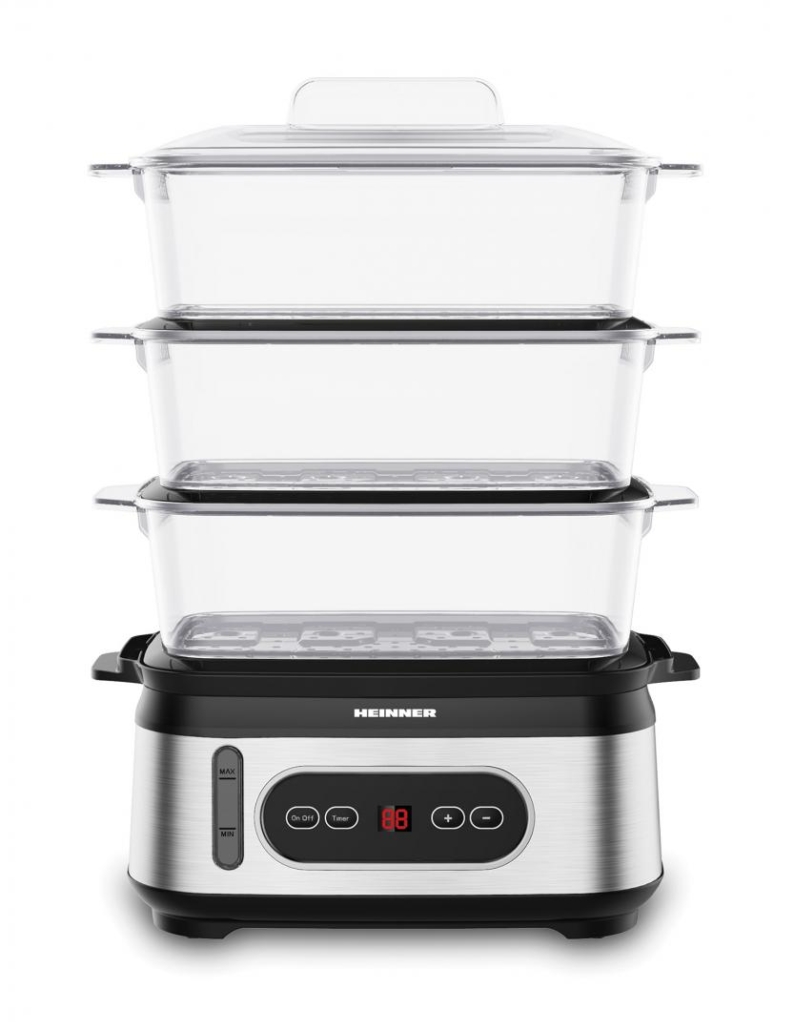 Steamer Heinner OneSteam HSA-D950SS, LED display, 3 layers steam containers BPA free, total cooking capacity: 9L, water tank capacity: 1.5L, timer 60 min, light indicator, boil-dry protection, power cord storage, power: 800-950W