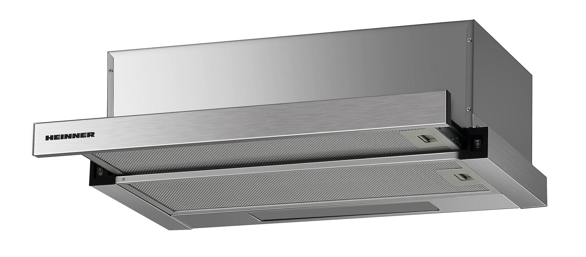 Telescopic cooker hood Heinner HTCH-440FS, 60cm, Max suction power: 329.6 m3/h, 2 power levels, Motor: 1 x 65W, LED light: 1 x 2W, 2 aluminum filters, Air outlet diameter: 150 mm, Dimensions ( WxDxH): 60x(28-43)x17.6 cm, Color: Stainless steel