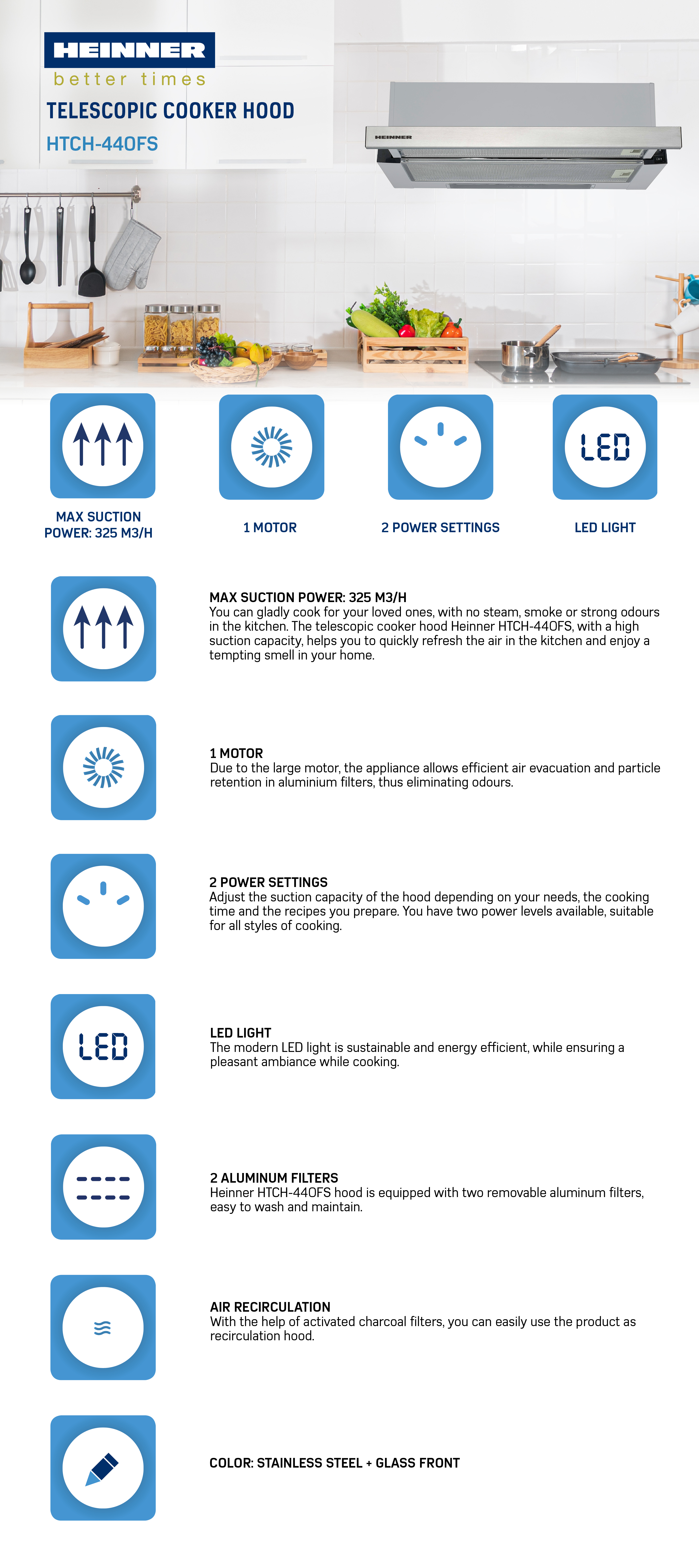 Telescopic cooker hood Heinner HTCH-440FS, 60cm, Max suction power: 329.6 m3/h, 2 power levels, Motor: 1 x 65W, LED light: 1 x 2W, 2 aluminum filters, Air outlet diameter: 150 mm, Dimensions ( WxDxH): 60x(28-43)x17.6 cm, Color: Stainless steel