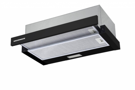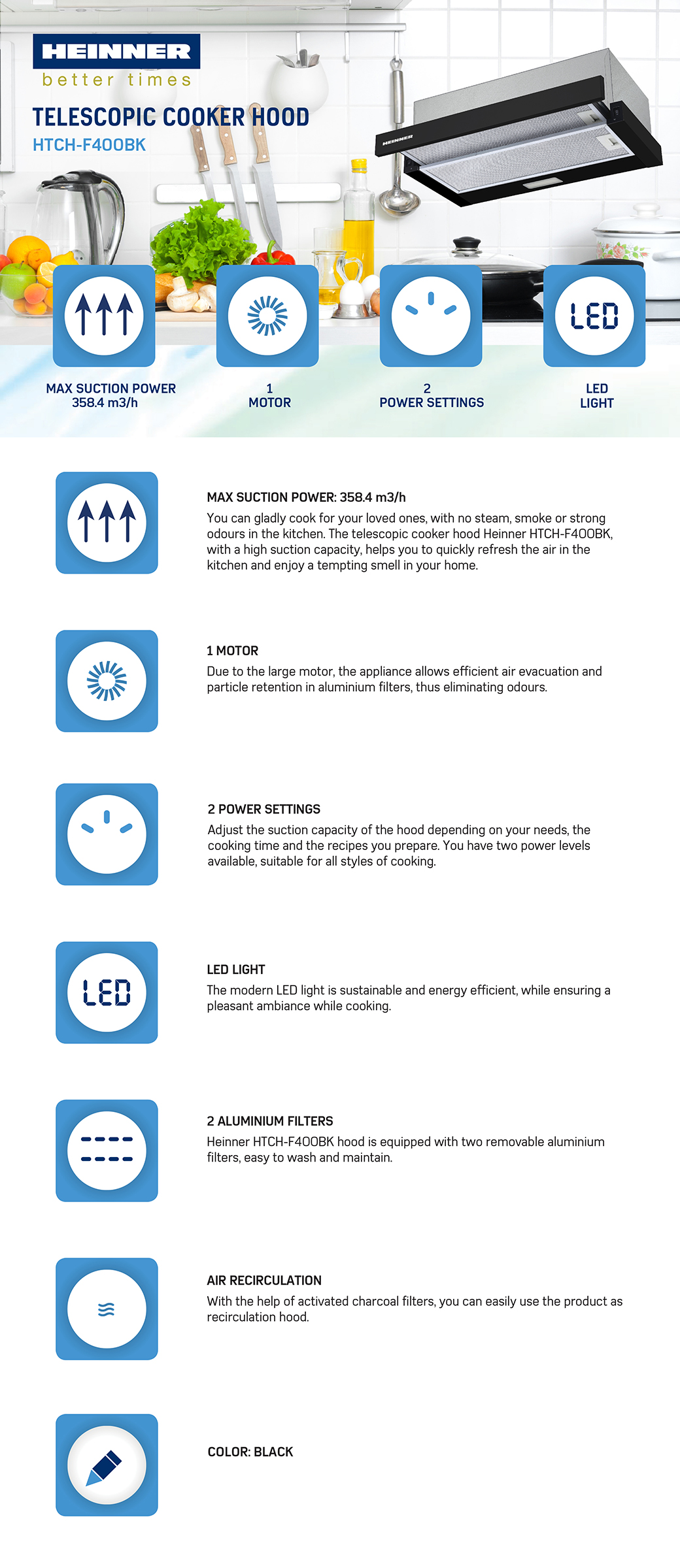 Telescopic cooker hood Heinner HTCH-F400BK, 60cm, Max suction power: 358.4 m3/h, 2 power levels, Motor: 1 x 65W, LED light: 1 x 2W, 2 aluminum filters, Air outlet diameter: 150 mm, Dimensions ( WxDxH): 59.5x(30-46.3)x22.5 cm, Color: Black