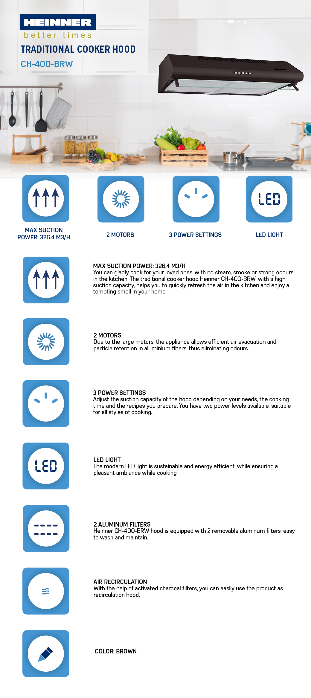 Traditional cooker hood Heinner CH-400-BRW, 60cm, Max suction power: 326.4 m3/h, 3 power levels, Motor: 2 x 60W, LED light: 1 x 2W, 2 aluminum filters, Glass front panel, Push buttons, Air outlet diameter: 120 mm, Dimensions ( WxDxH): 60x50x15 cm, Color: Brown