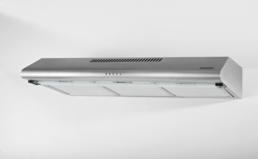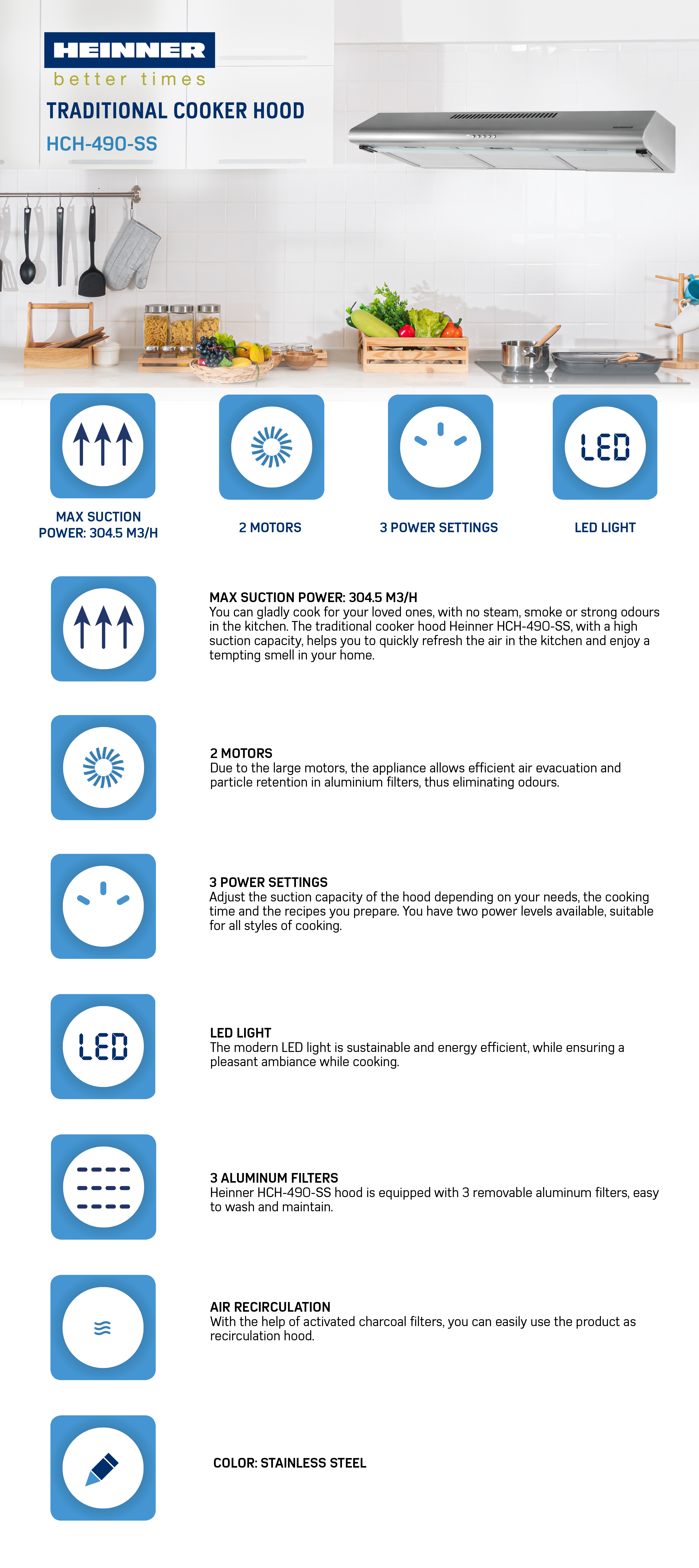 Traditional cooker hood Heinner HCH-490-SS, 90cm, Max suction power: 304.5 m3/h, 3 power levels, Motor: 2 x 60W, LED light: 2 x 2W, 3 aluminum filters, Glass front panel, Push buttons, Air outlet diameter: 120 mm, Dimensions ( WxDxH): 90x50x15 cm, Color: Stainless steel