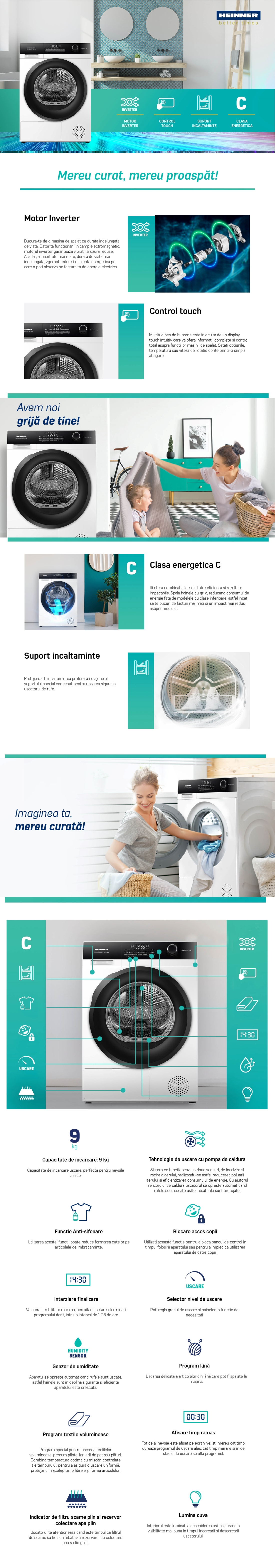 USCATOR DE RUFE CU POMPA DE CALDURA HEINNER HHPD-HMK90IVFC+++, CAPACITATE INCARCARE 9KG, CLASA ENERGETICA C, MOTOR INVERTER, DISPLAY DIGITAL CU CONTROL TOUCH, LUMINA CUVA, 14 PROGRAME, SUPORT INCALTAMINTE, PROGRAM BABY CARE, PROGRAM LANA, PROGRAM ECO, FUNCTIE START INTARZIAT, FUNCTIE ANTISIFONARE, SENZOR UMIDITATE, BLOCARE ACCES COPII, INDICATOR CURATARE FILTRU SCAME, INDICATOR REZERVOR COLECTARE APA PLIN, DIMENSIUNI(LxAxI); 59.5x66x84.5 ALB